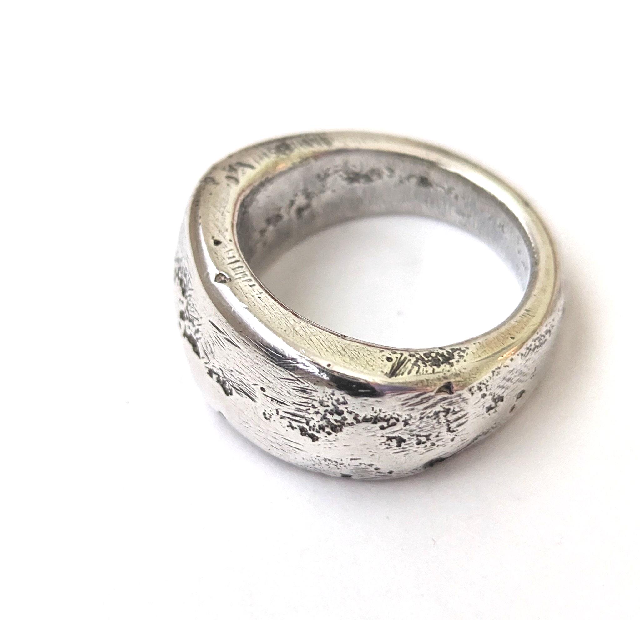This ring is made from sterling silver which has been melted down and cast in sand. A patina has been applied to highlight the natural sand texture.
