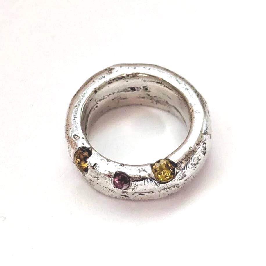 Yellow and pink sapphire ring, in organic brutalist style with natural texture.