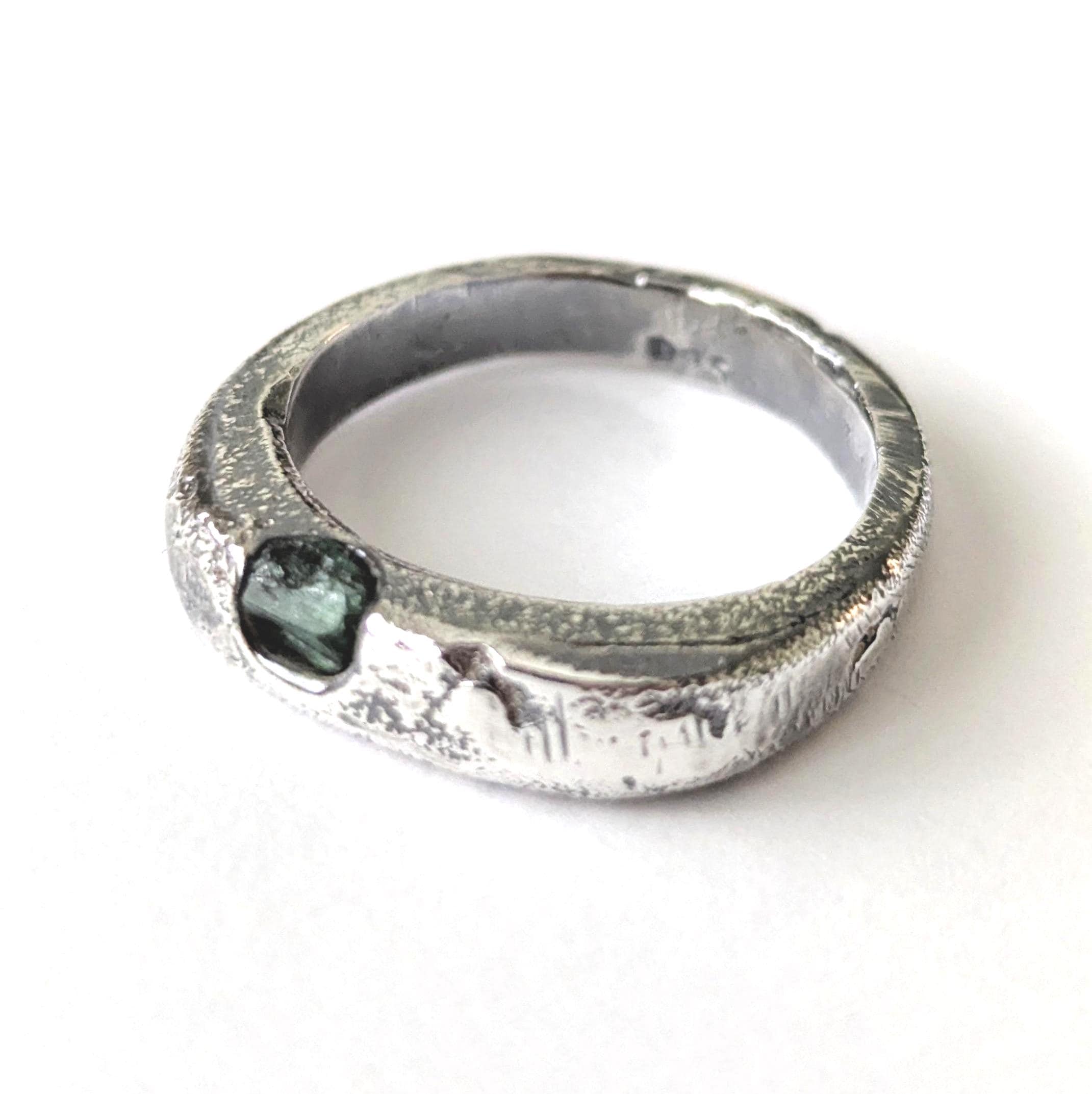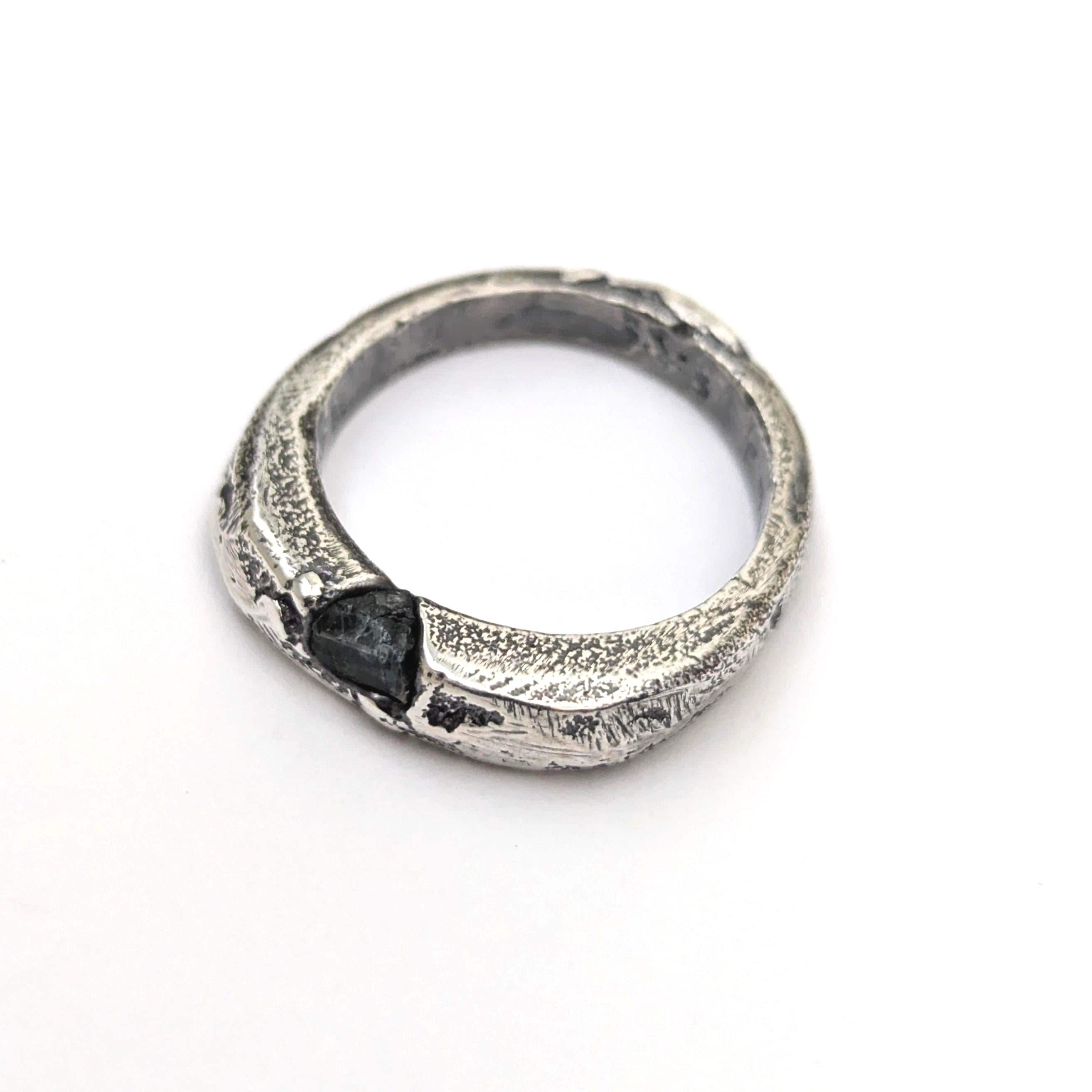Imprints of the sand from this casting method are left in the silver for a rustic finish. The silver is oxidised adding contrast to the sparkling gemstone and depth to the texture.