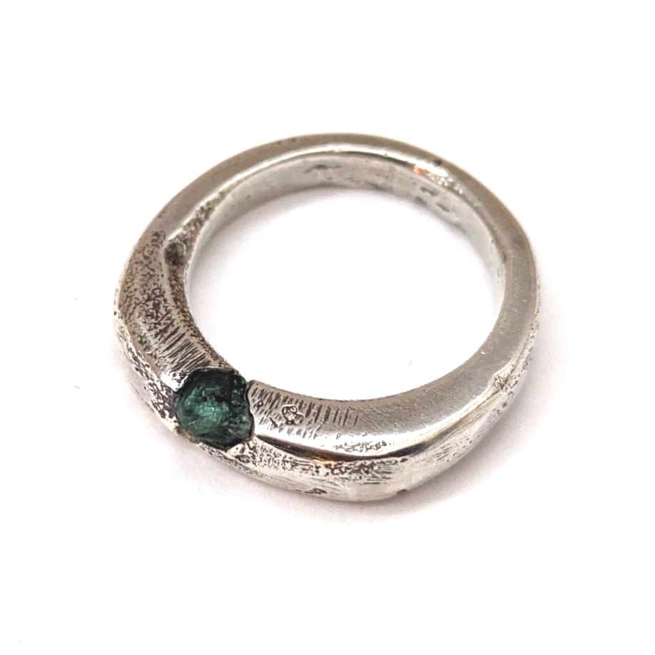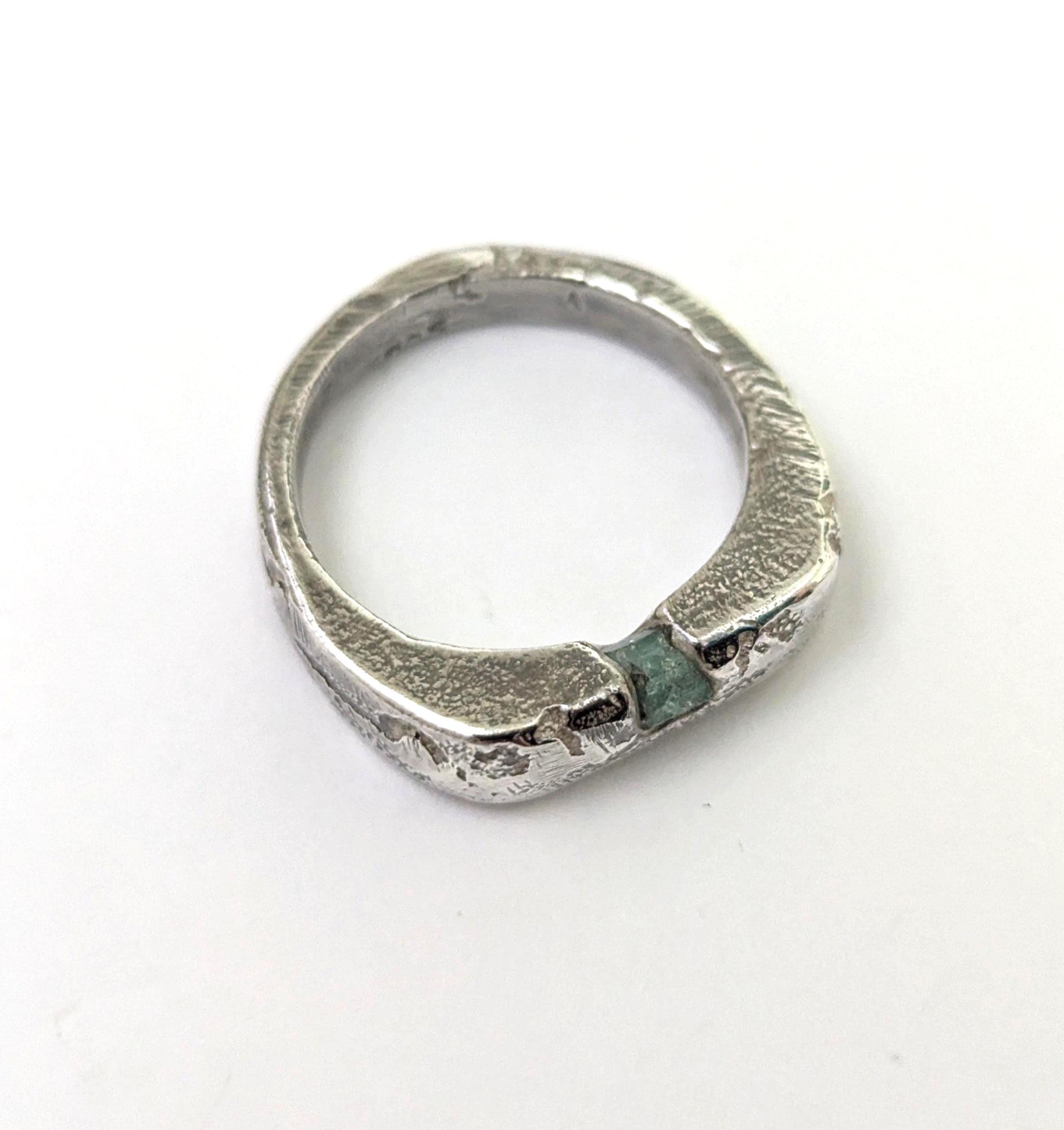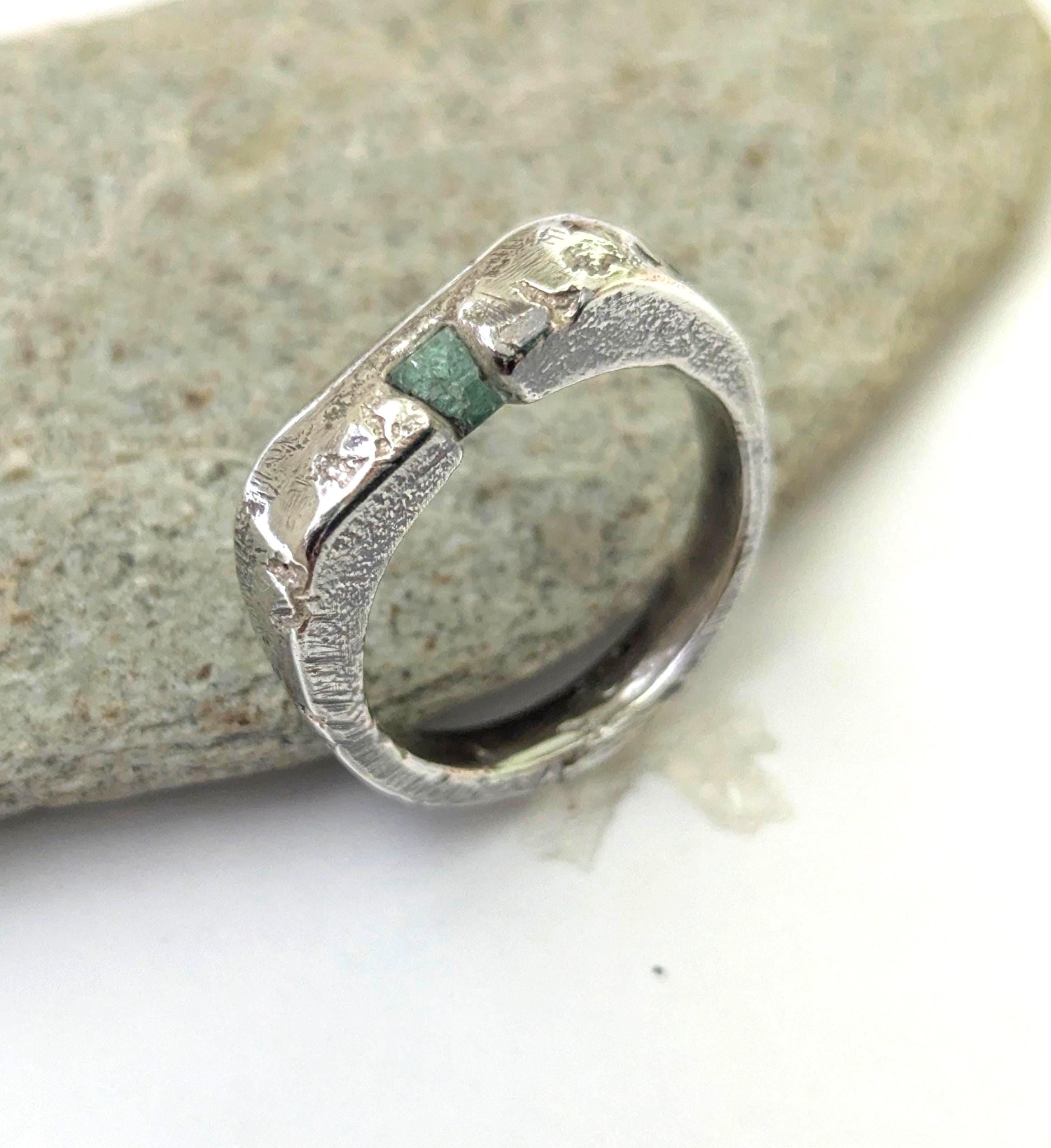 This ring is cast in sand as one solid piece with sterling silver, made from an original design carved in wax. The emerald is placed in the sand before casting, due to the flow of the metal stone may shift during the metal pour adding to the organic aesthetic process.