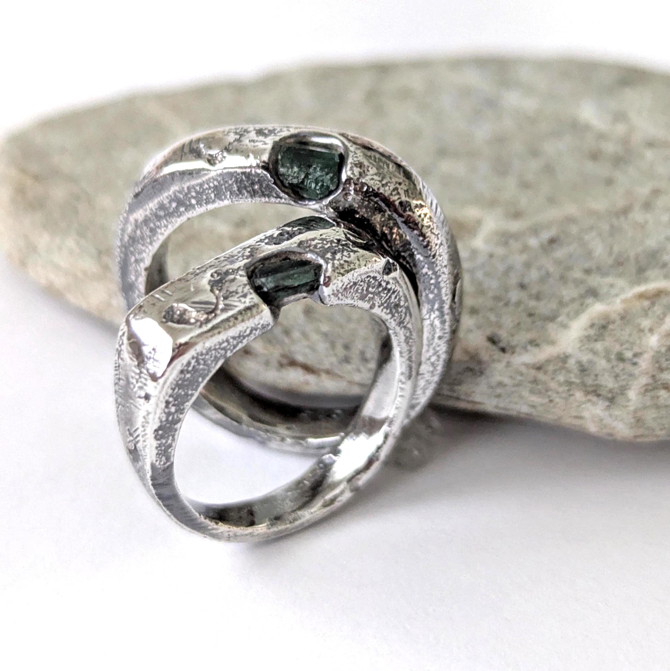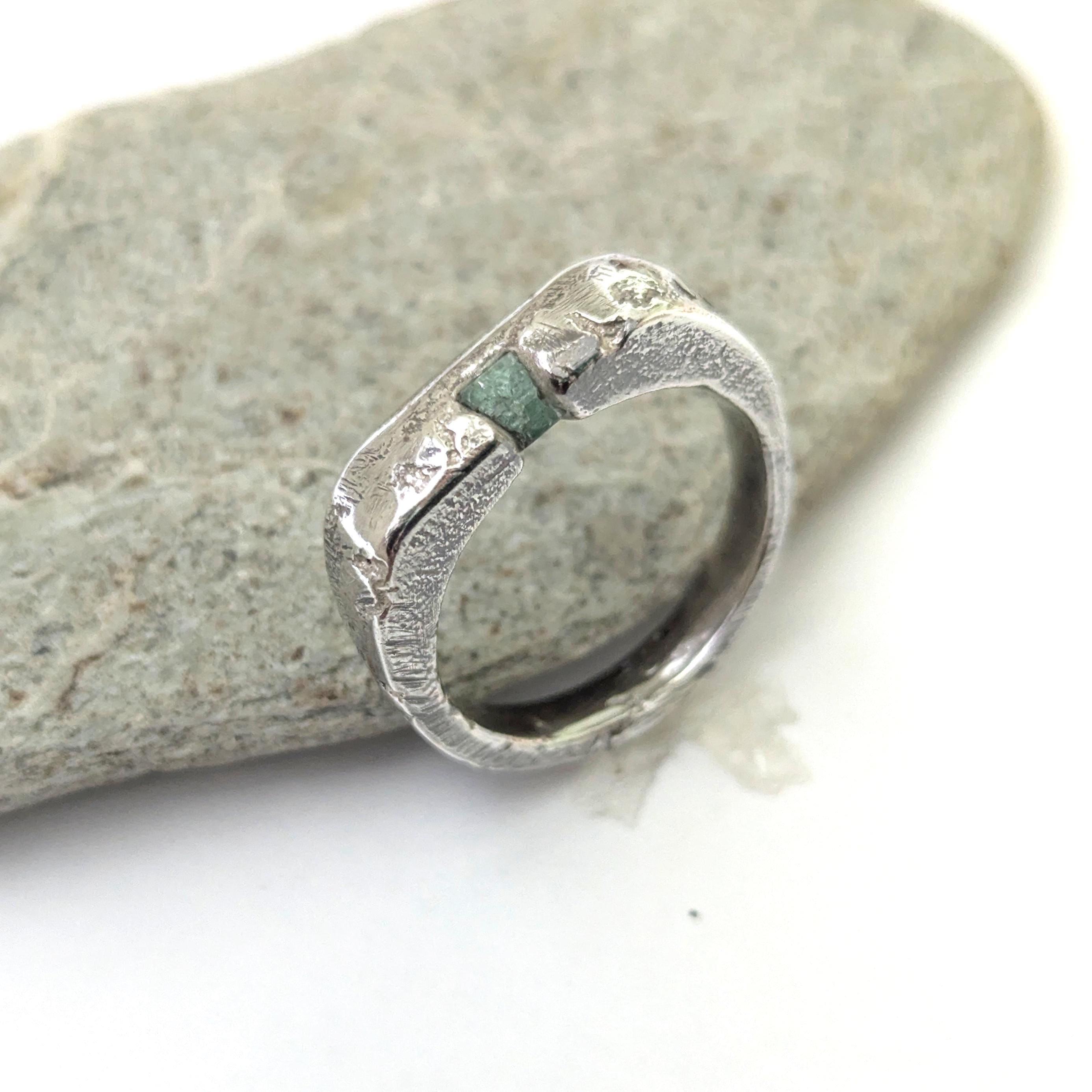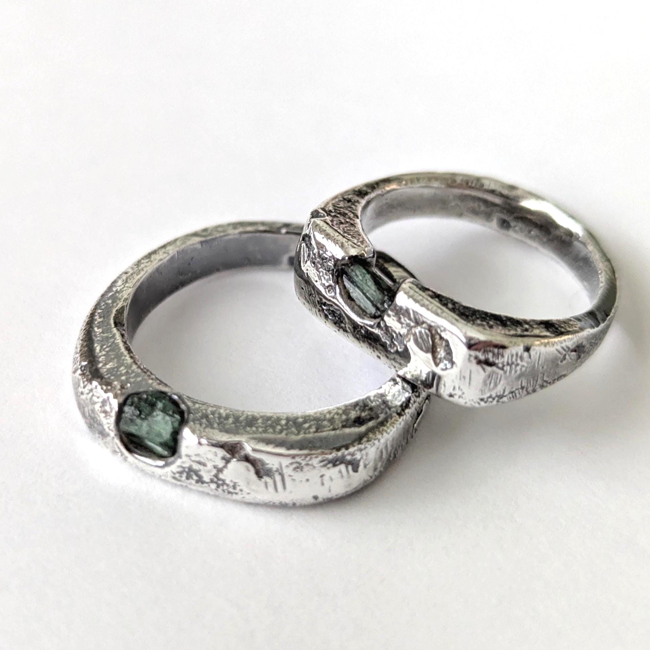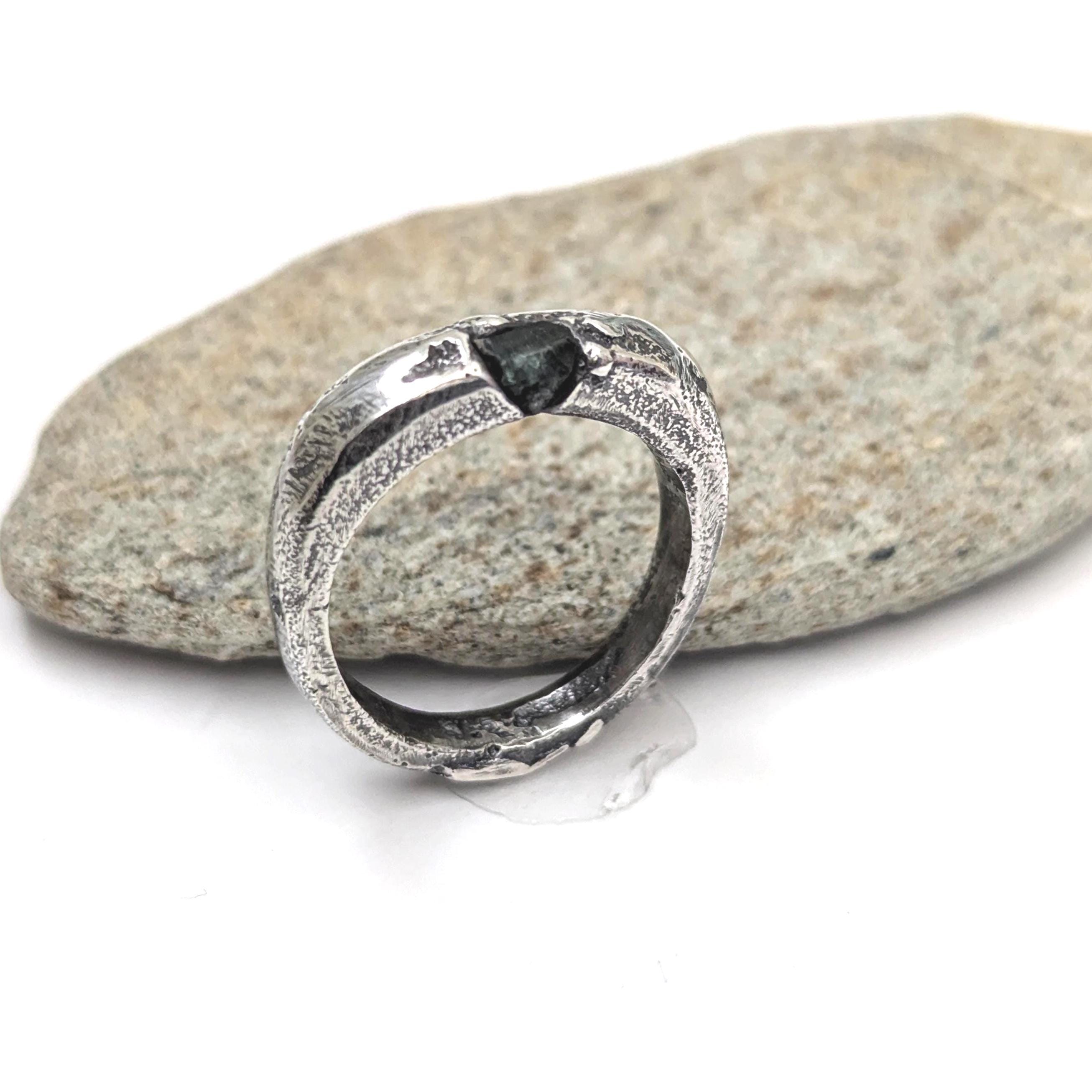 Each ring in this style is one of a kind and can not be duplicated to be exactly the same due to variations in the casting process as well as the variation of each raw stone. Please browse through the photos so as to appreciate the beautiful variations that occur organically with this style of ring.