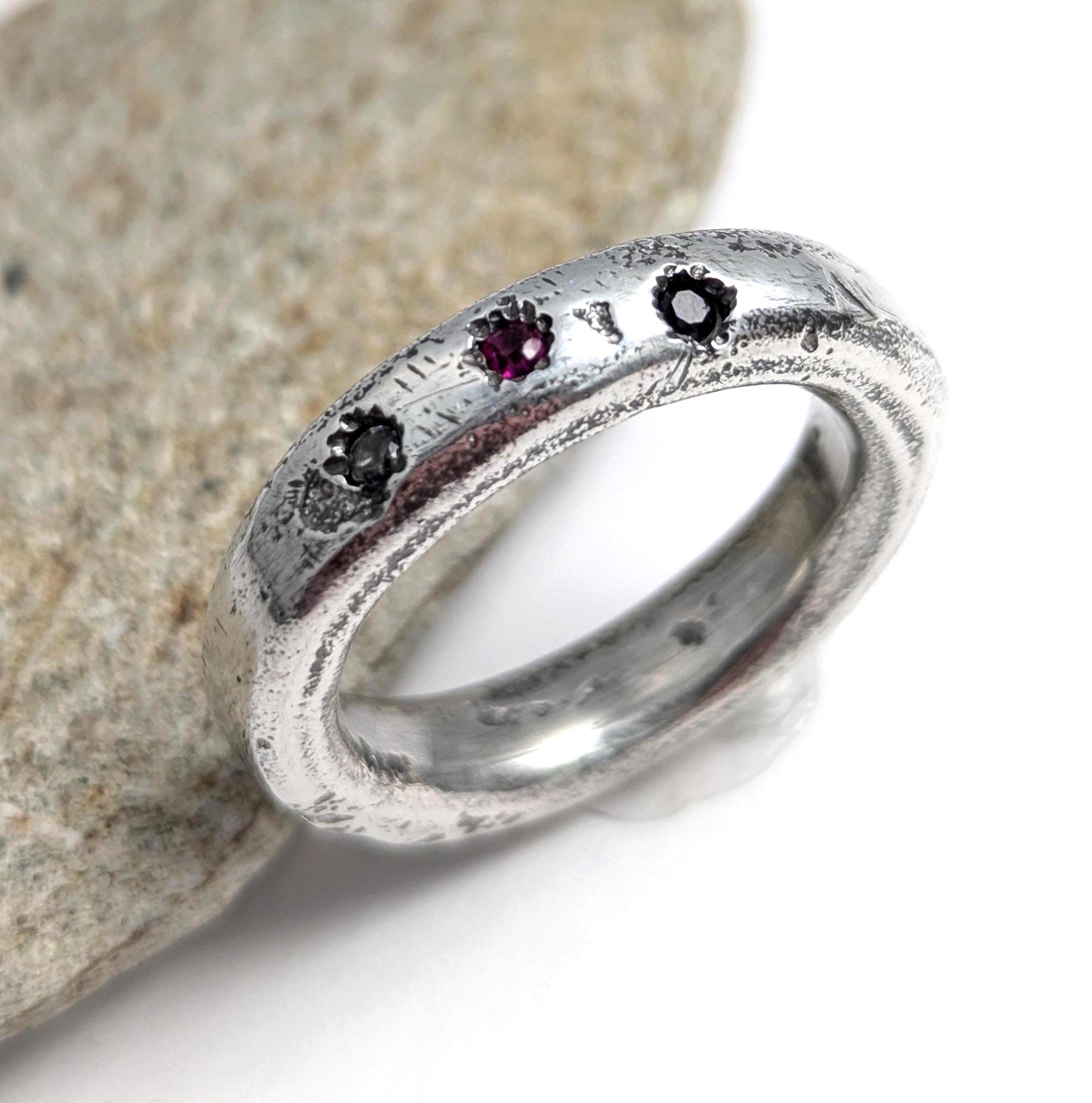 This ring is cast in sand as one solid piece with sterling silver, made from an original design carved in wax. The labgrown gemstones were flush set after casting.