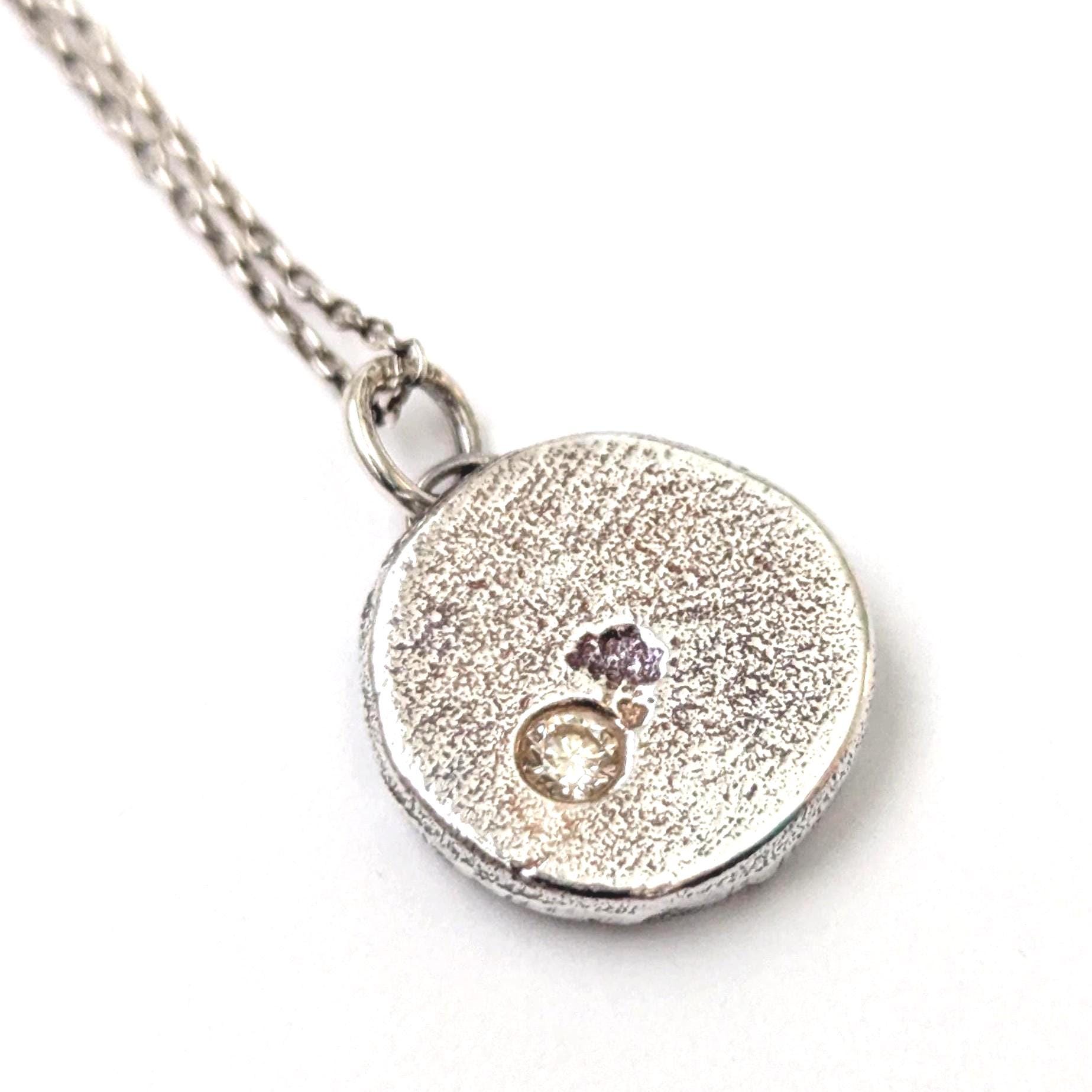 Chunky flat pebble style solid silver sandcast pendant with champagne moissanite.