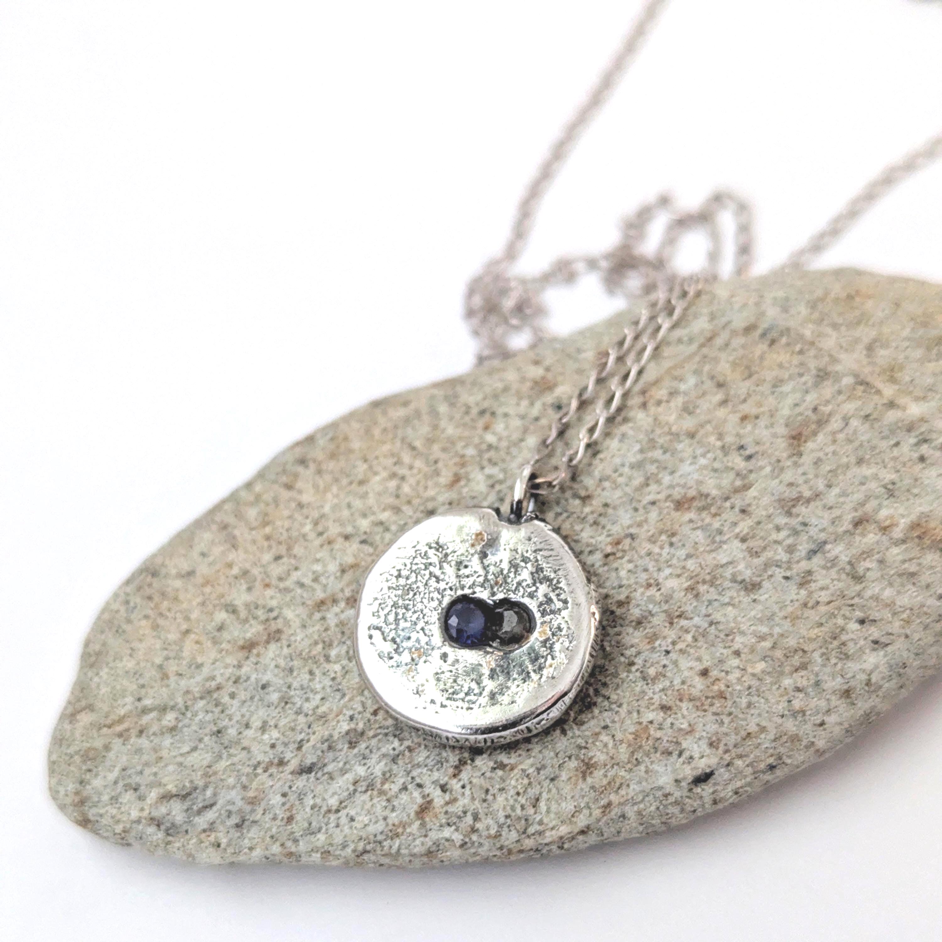 Chunky flat pebble style solid silver sandcast pendant with sapphire and tourmaline.