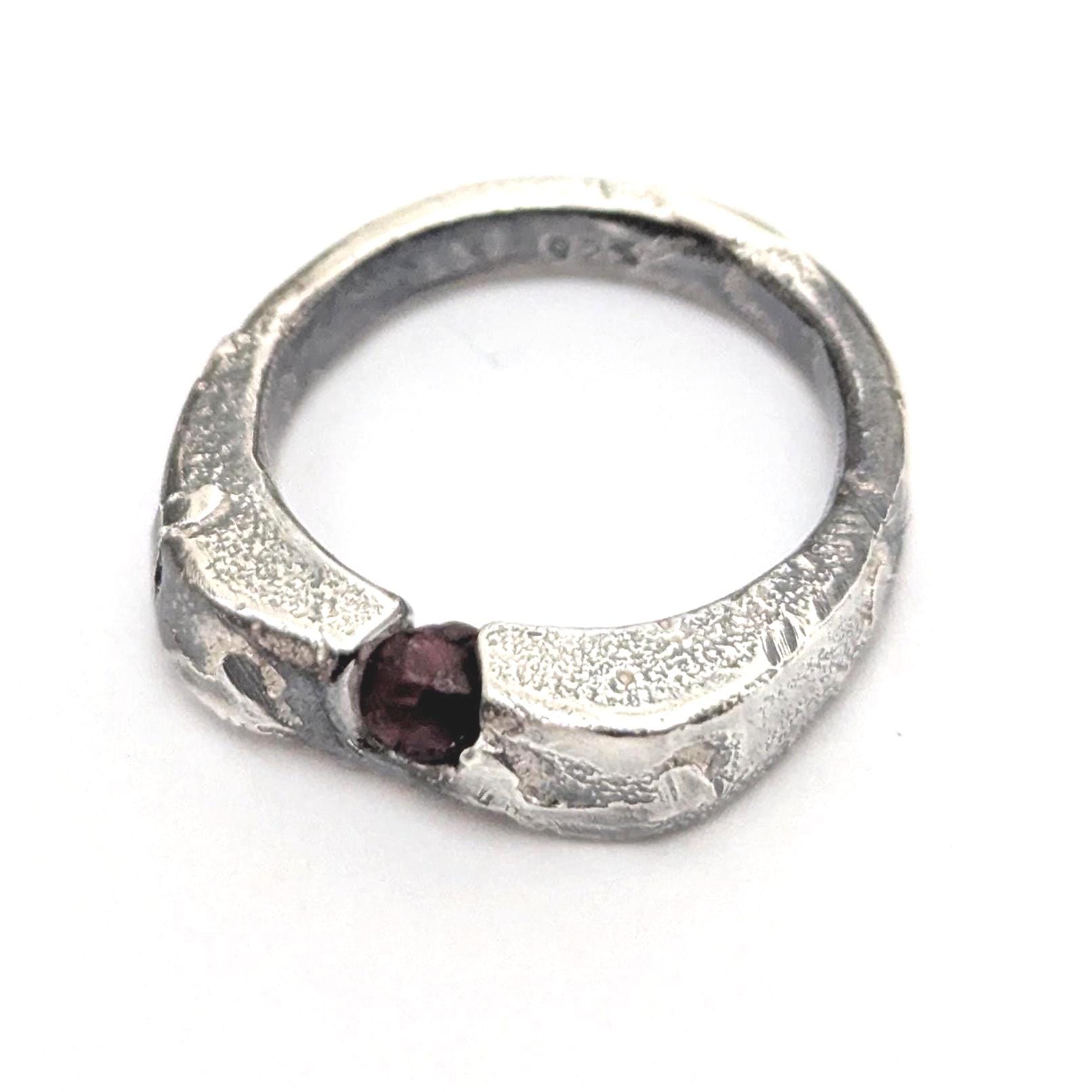 This ring is hand cast as one solid piece with sterling silver by pouring molten silver into a sand mould. The mould is made from an original design carved in wax. The garnet was placed in the sand before casting and has been set with the natural flow of the silver.