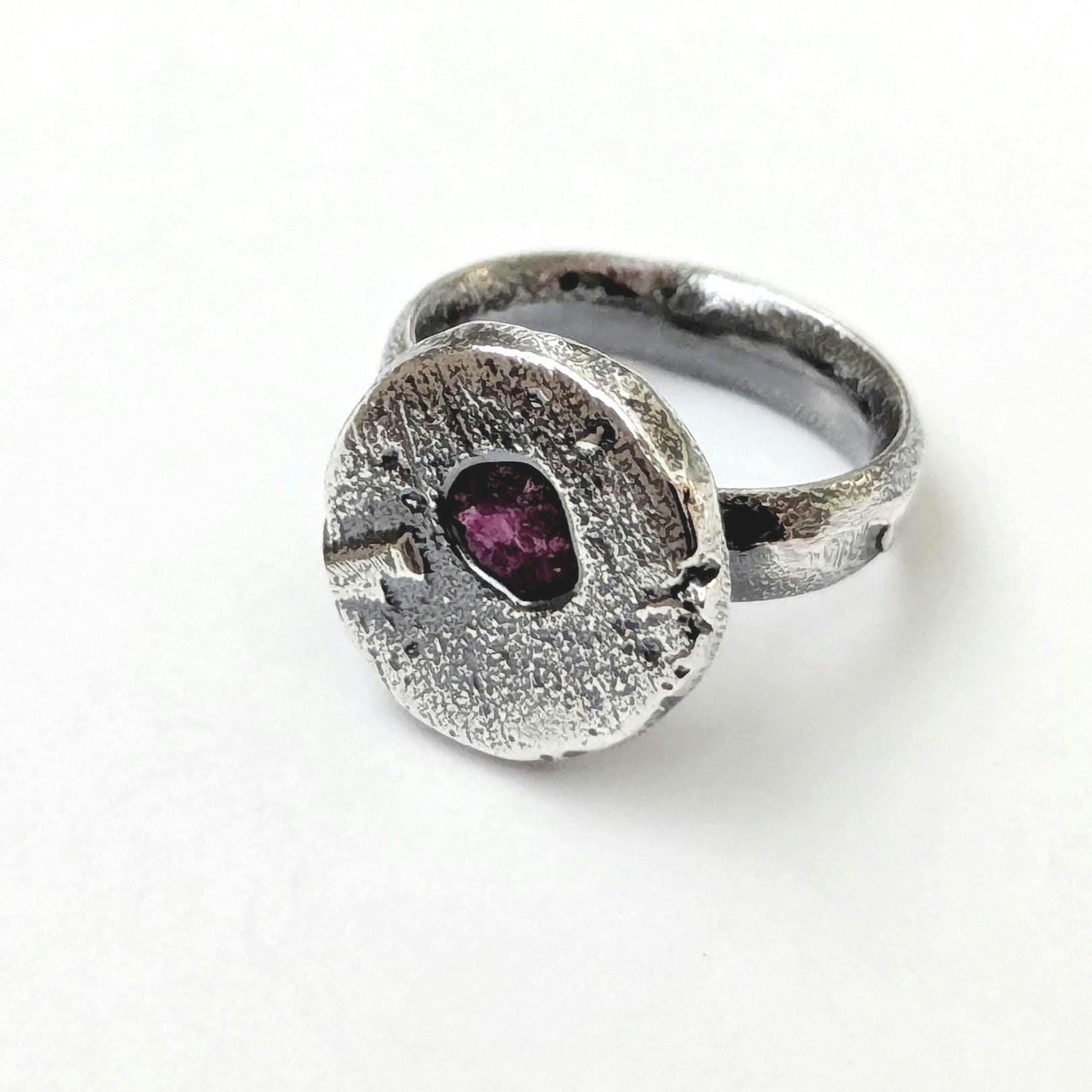 Sandcast statement ring with natural raw ruby.