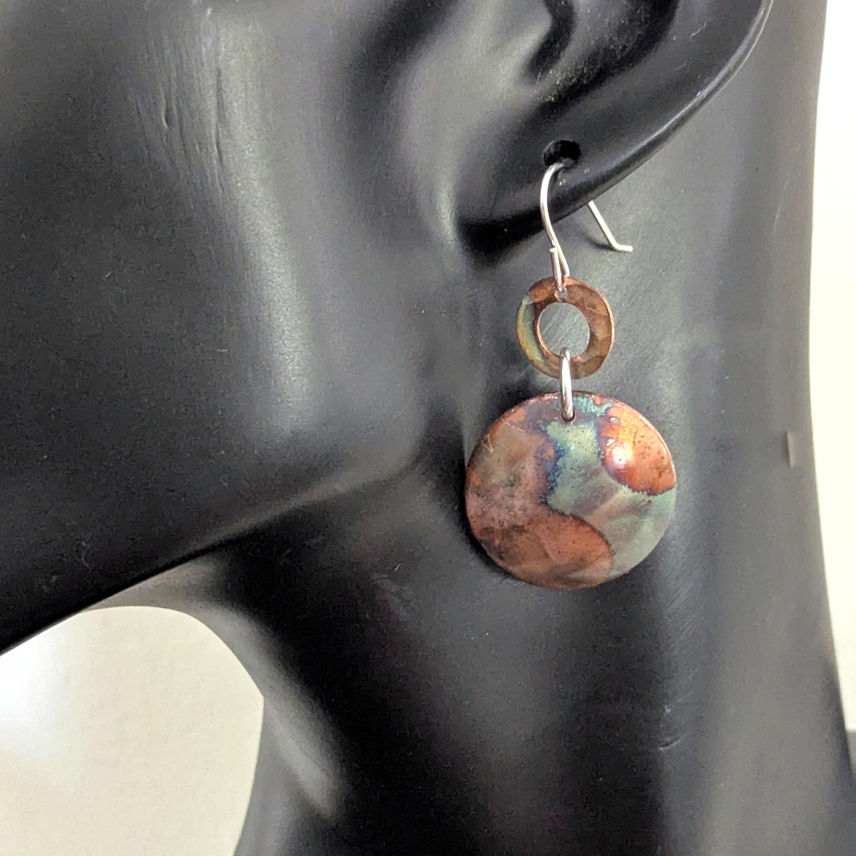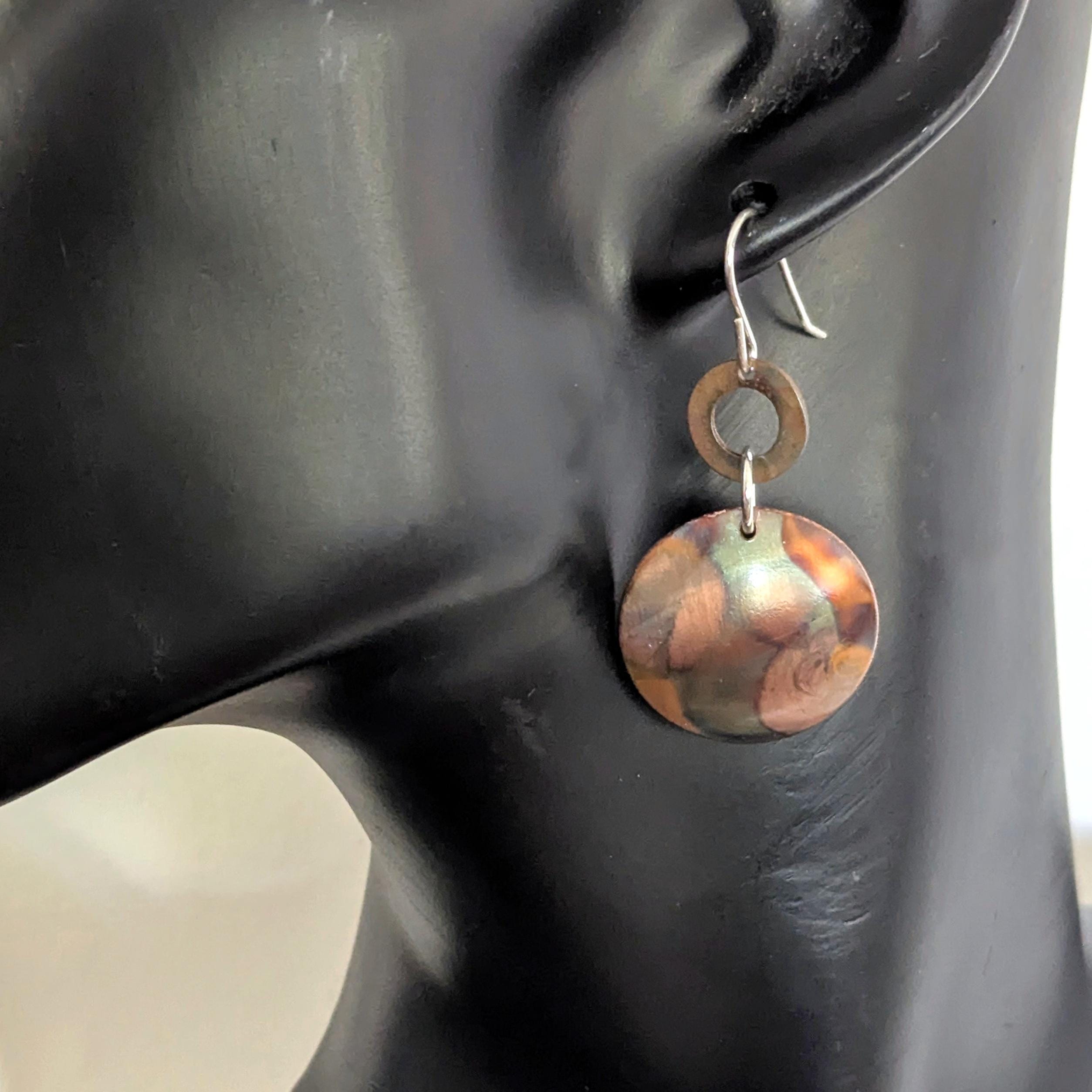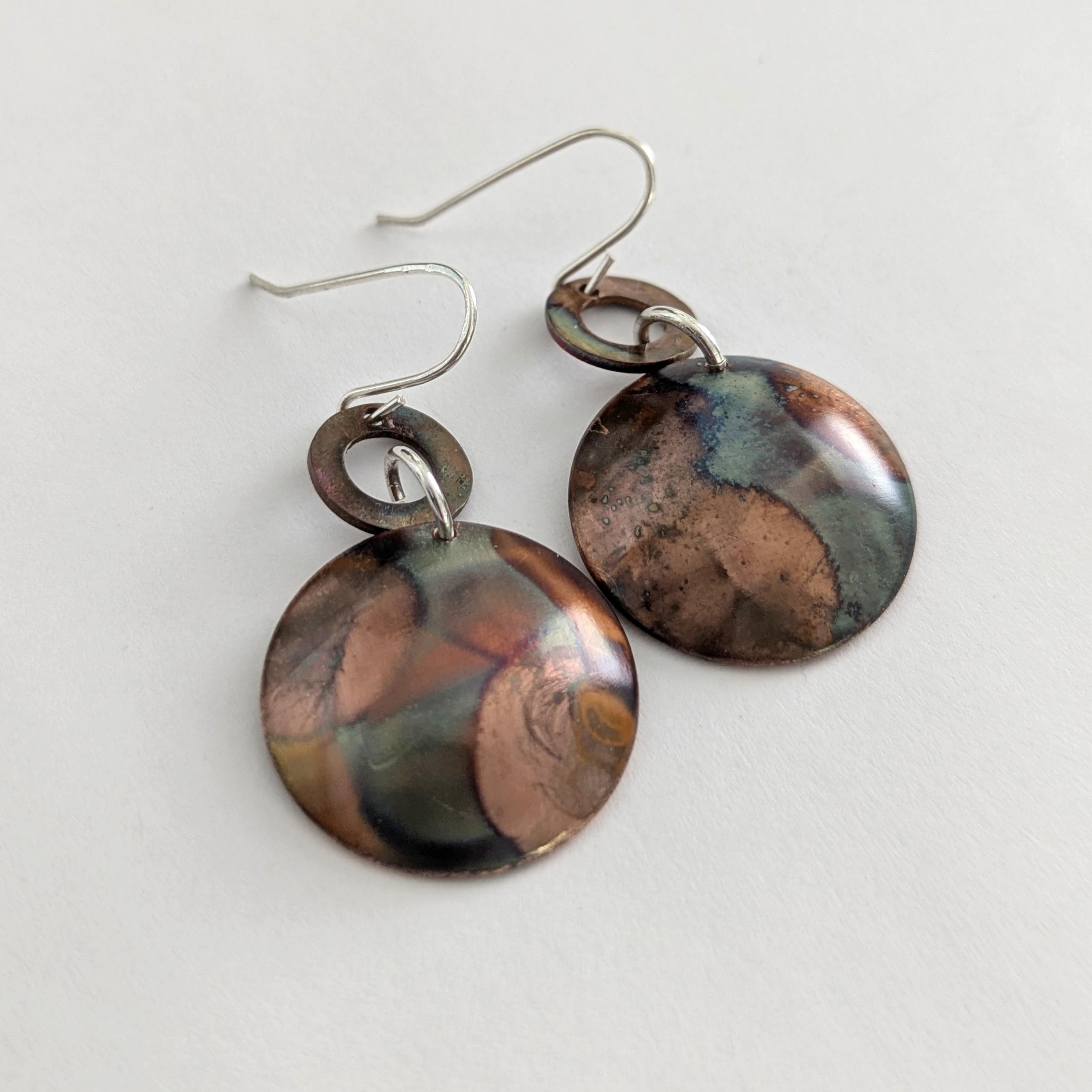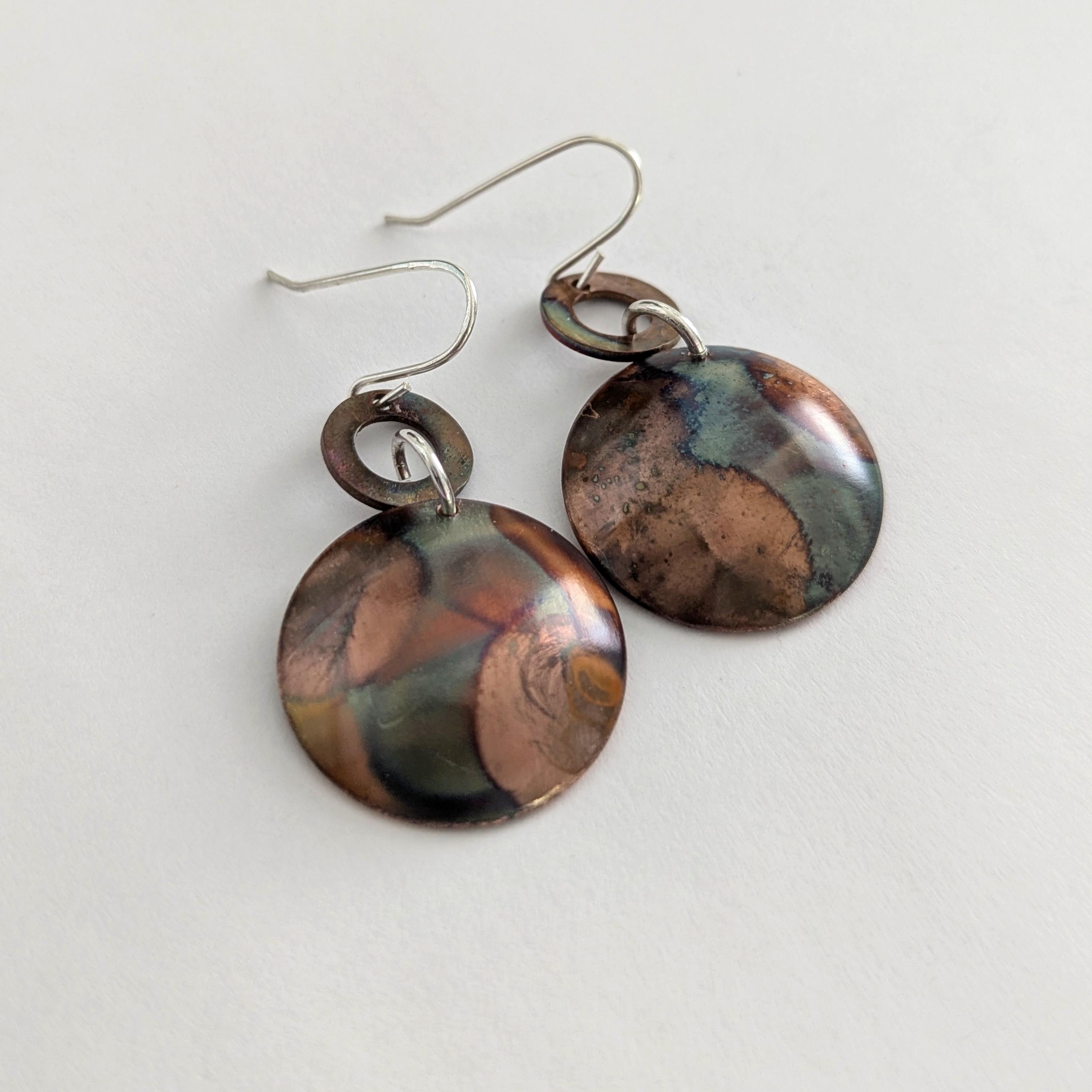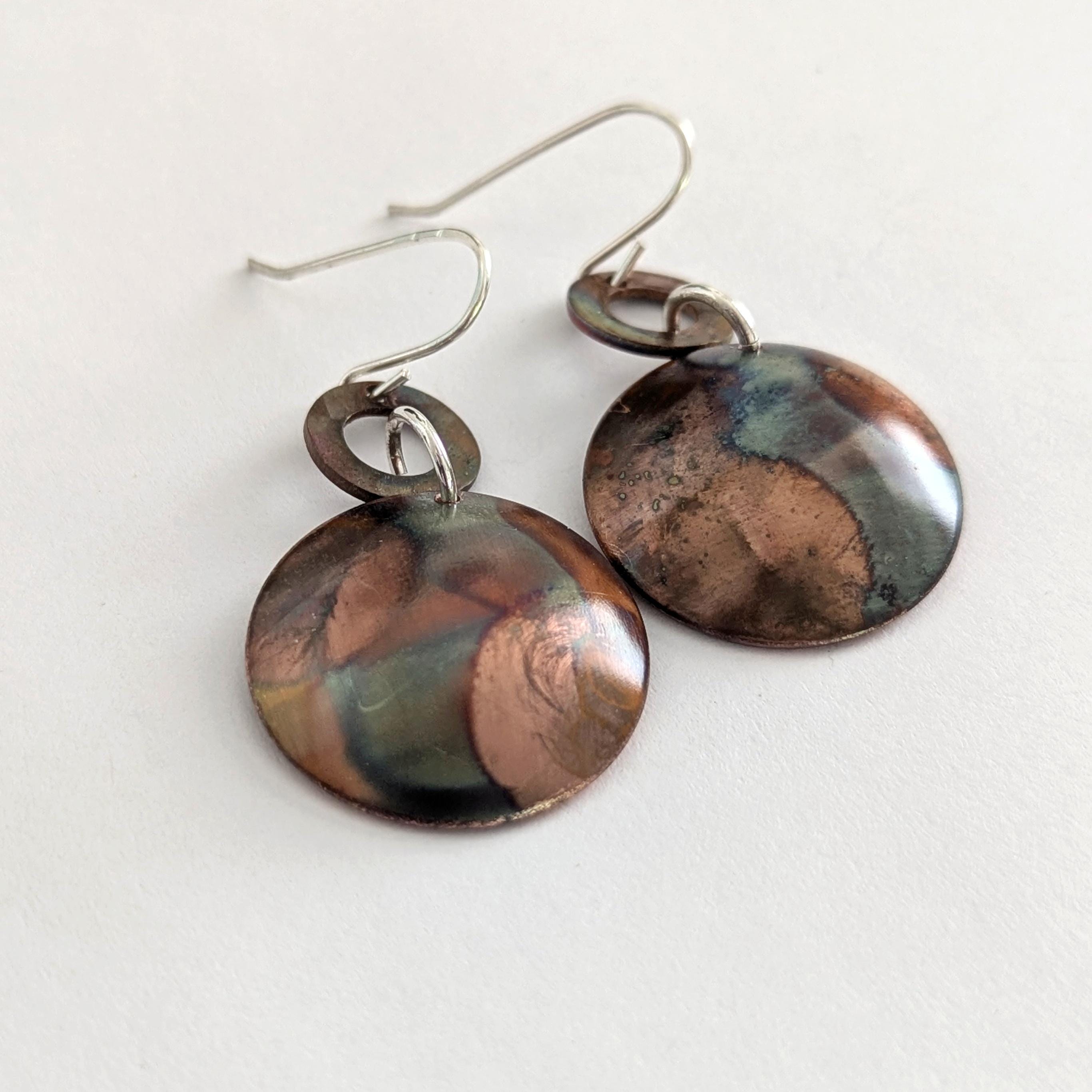 Domed dangle earrings; flame painted copper, sterling silver hooks