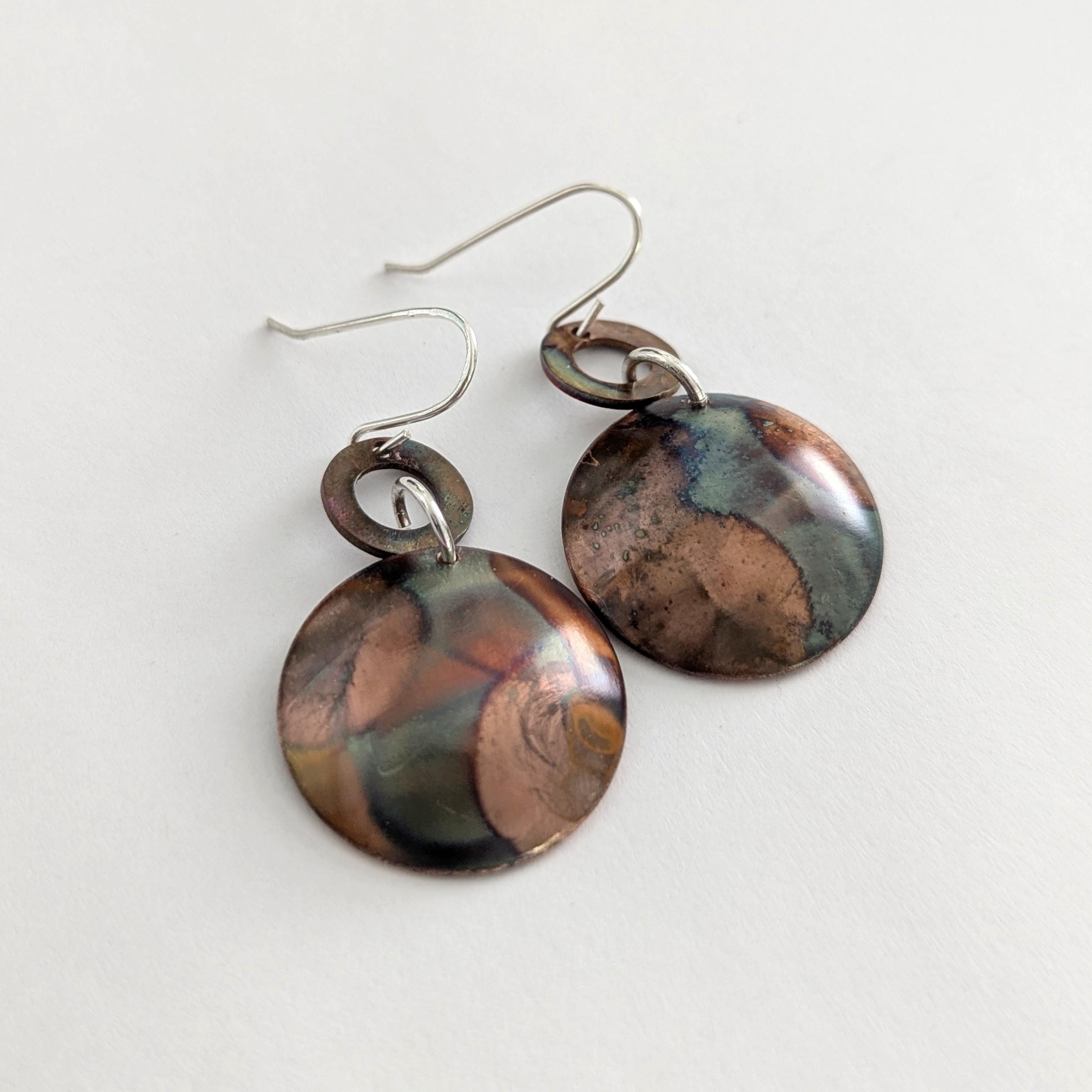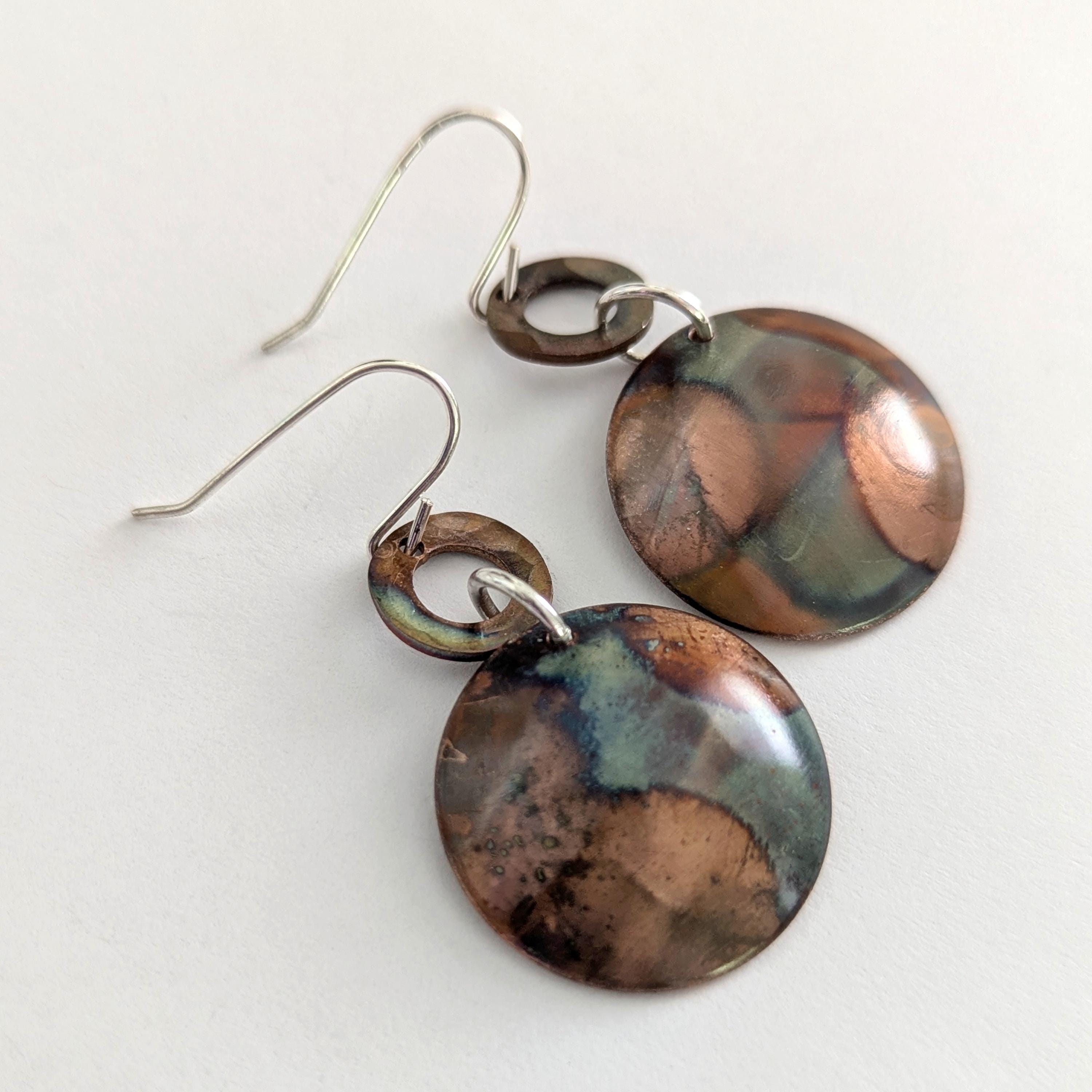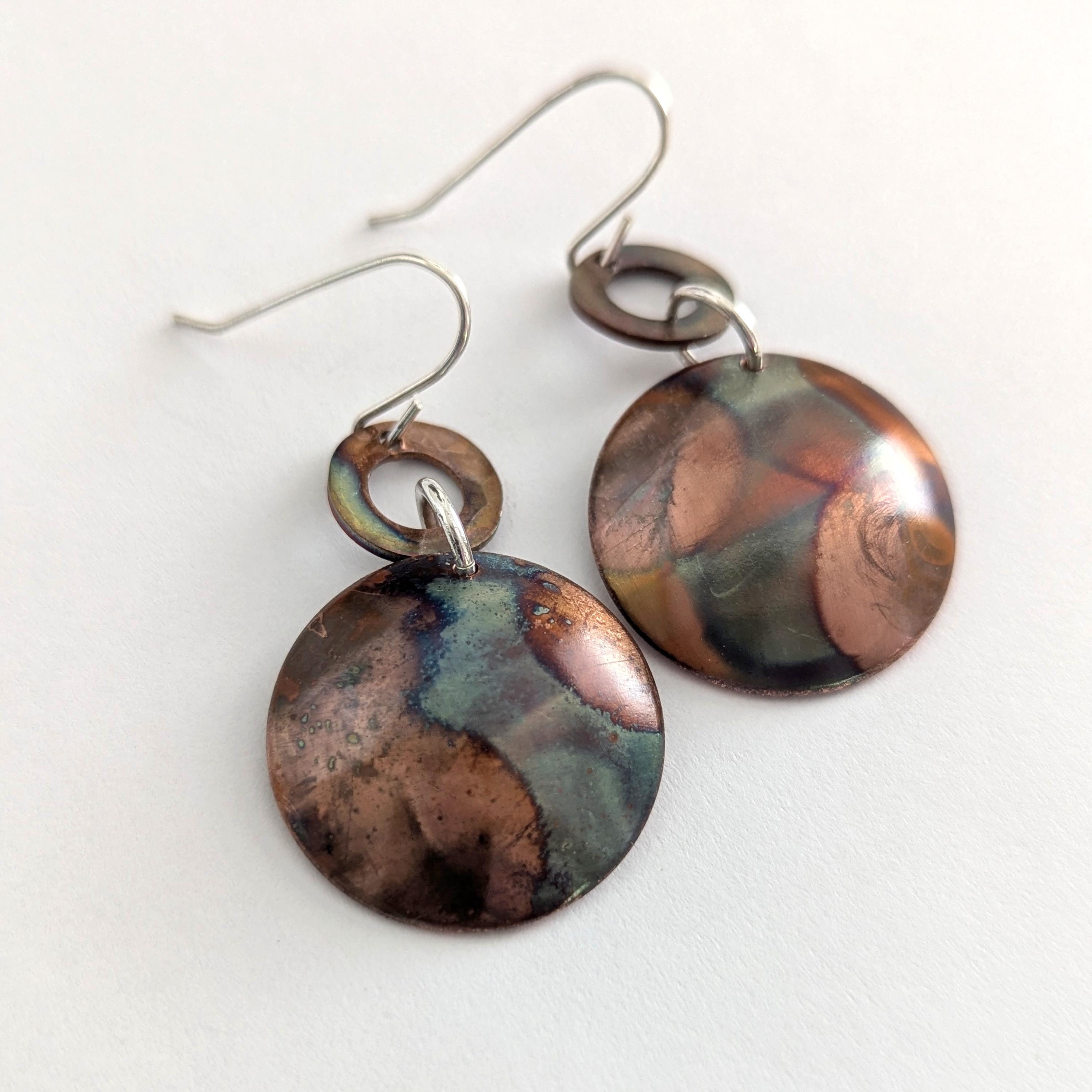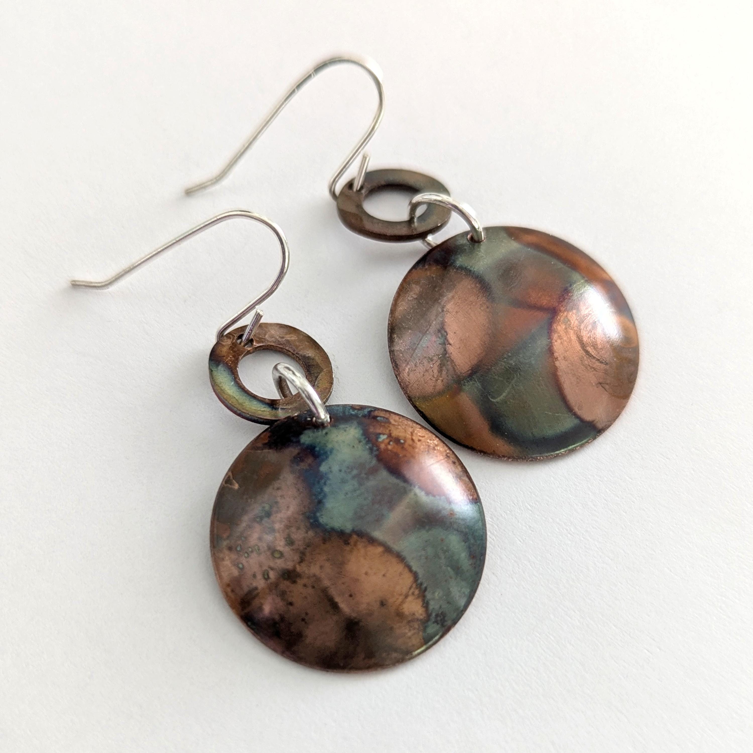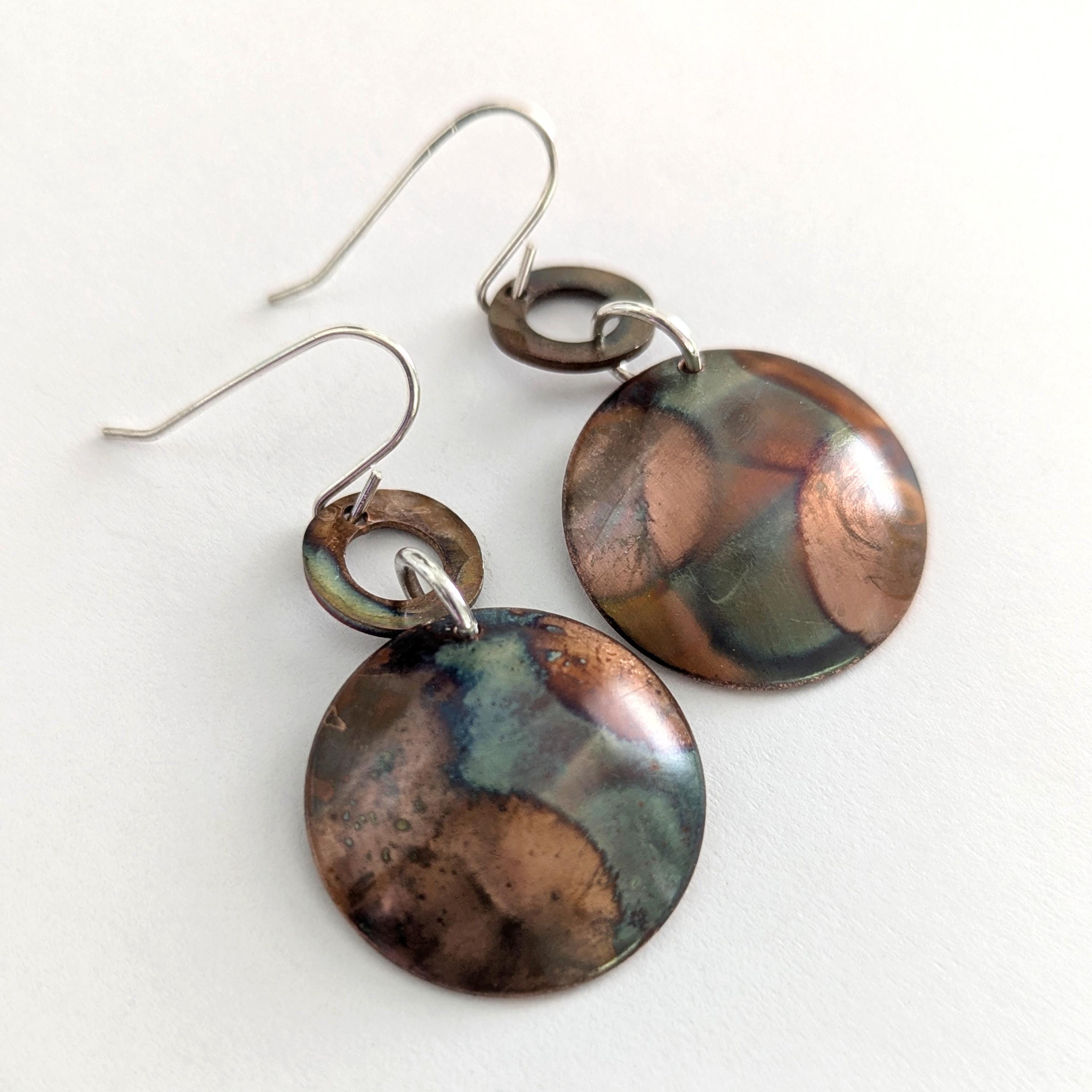 Flame painting is a technique that brings out natural colours from the copper. Each pair of earrings is unique with an organic effect.