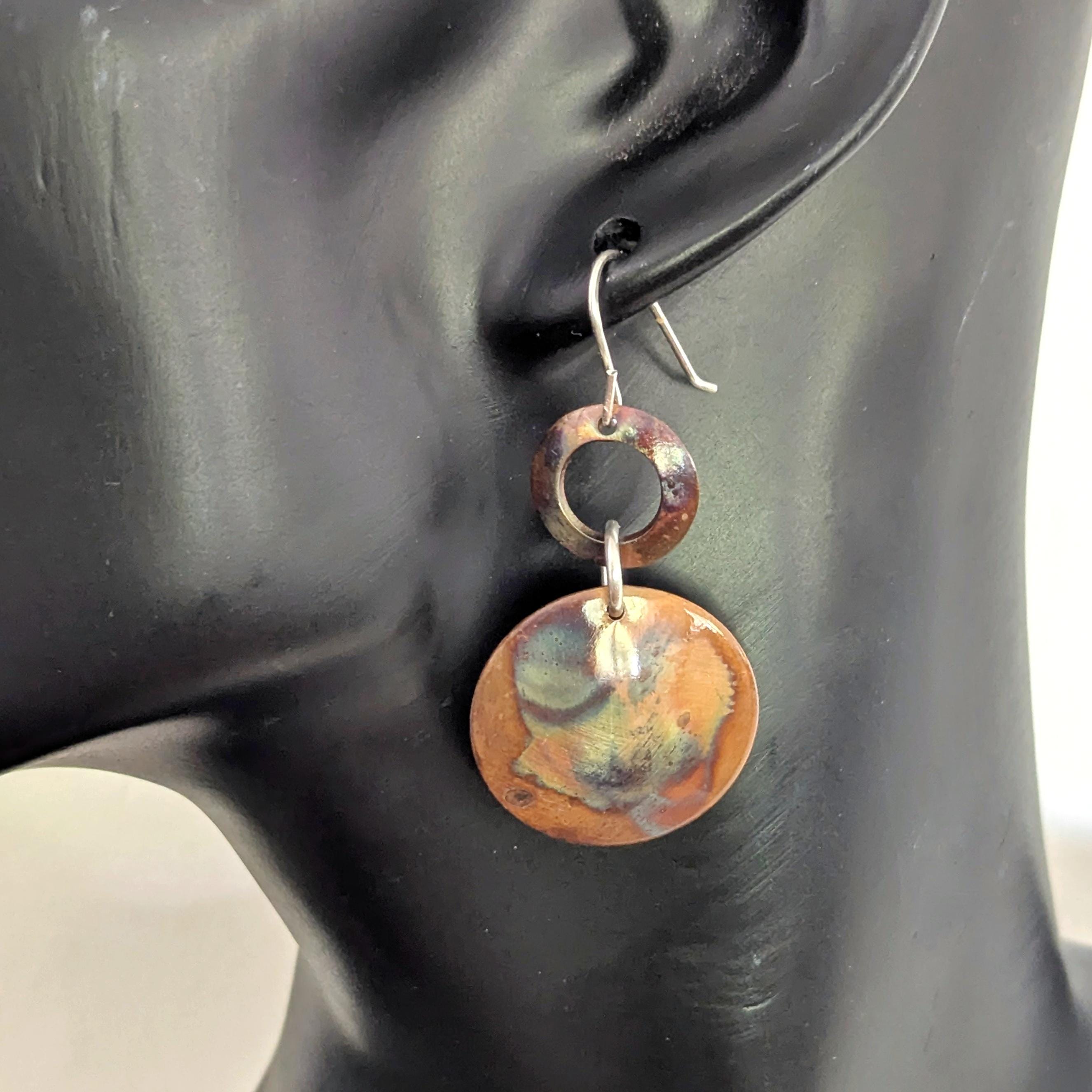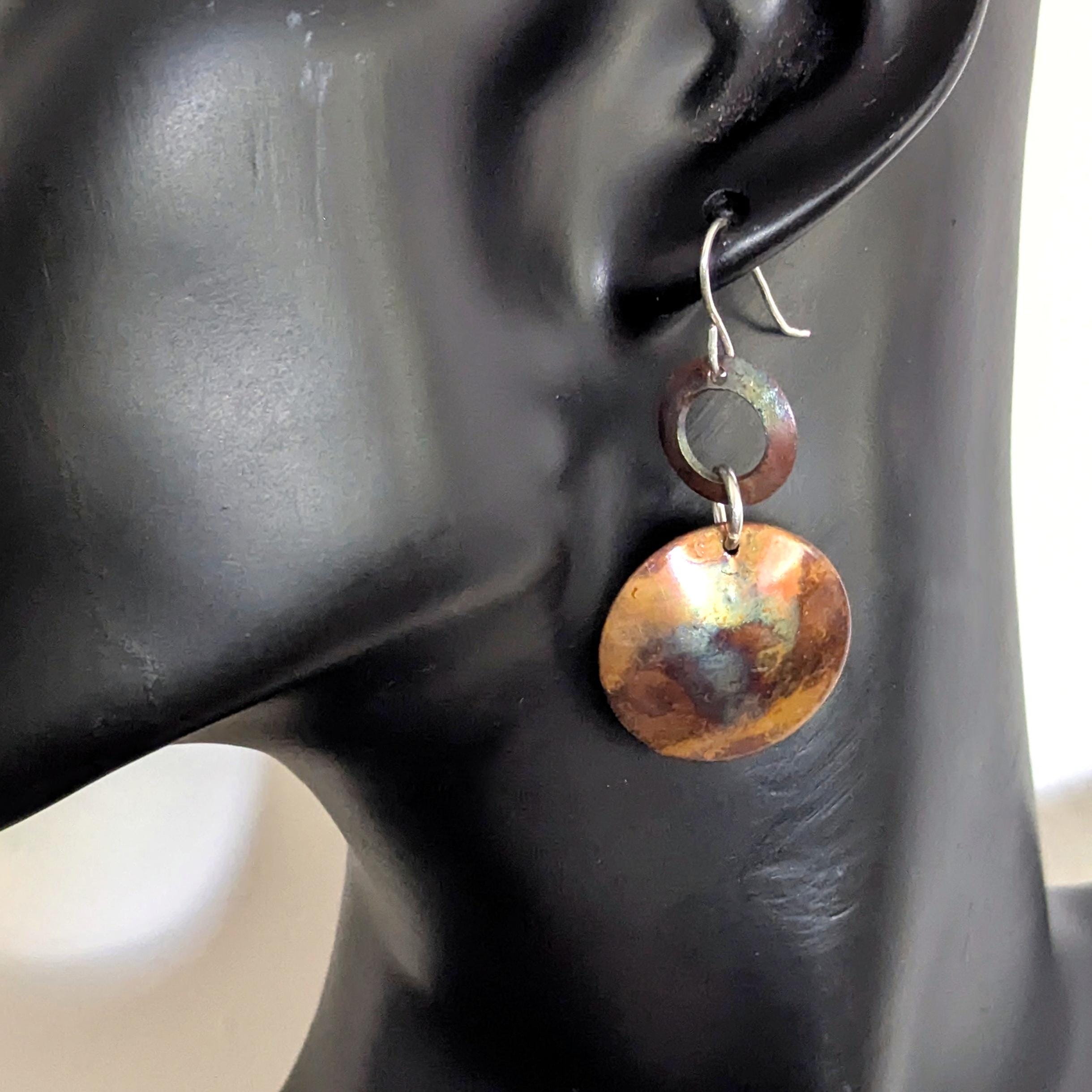 Copper domed earrings; flame painted dangles, sterling silver hooks
