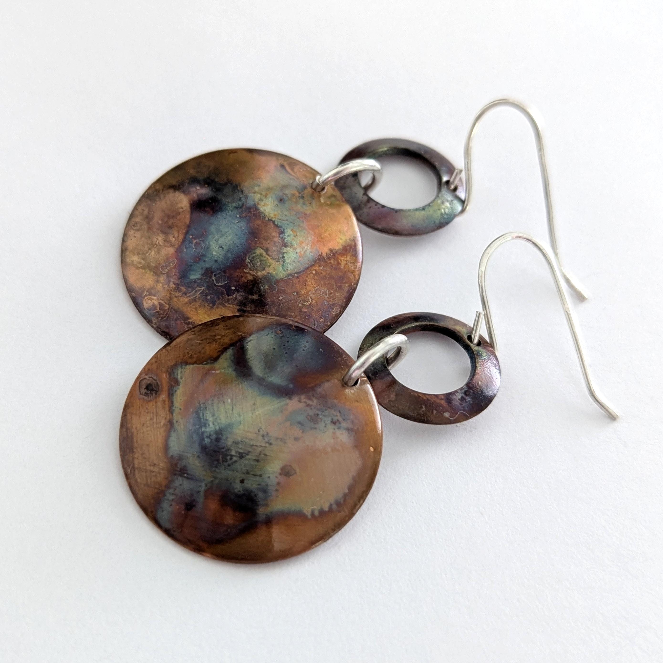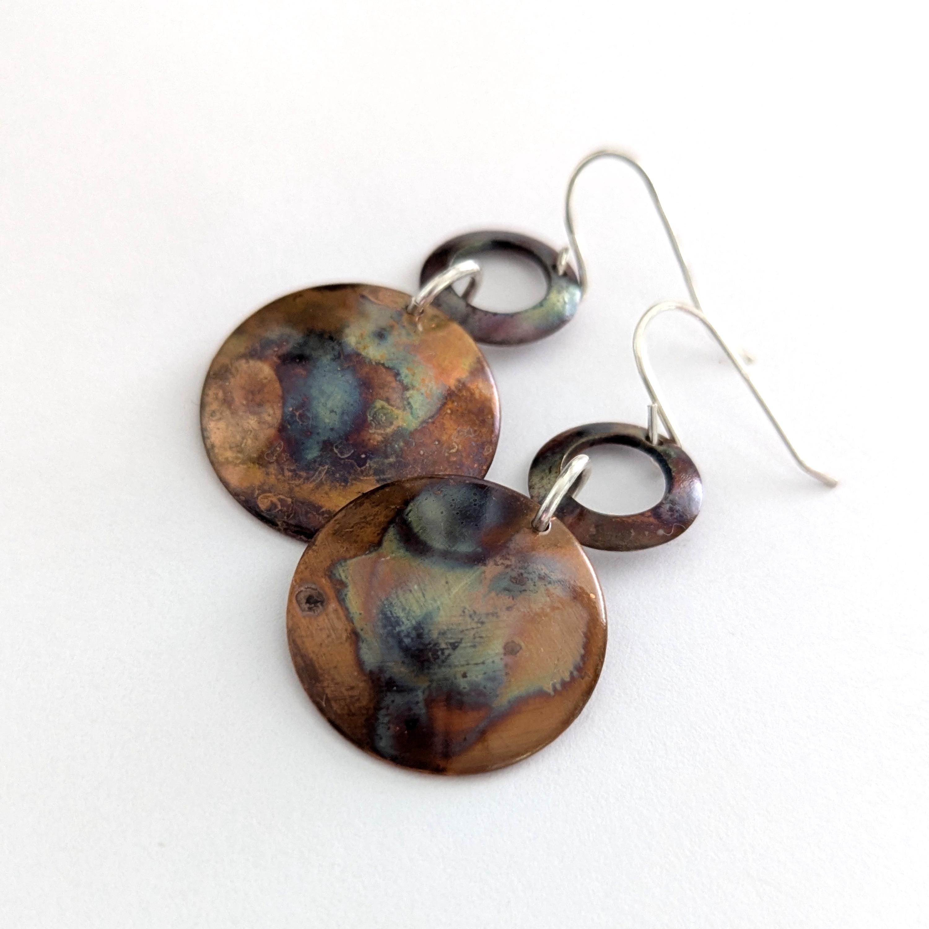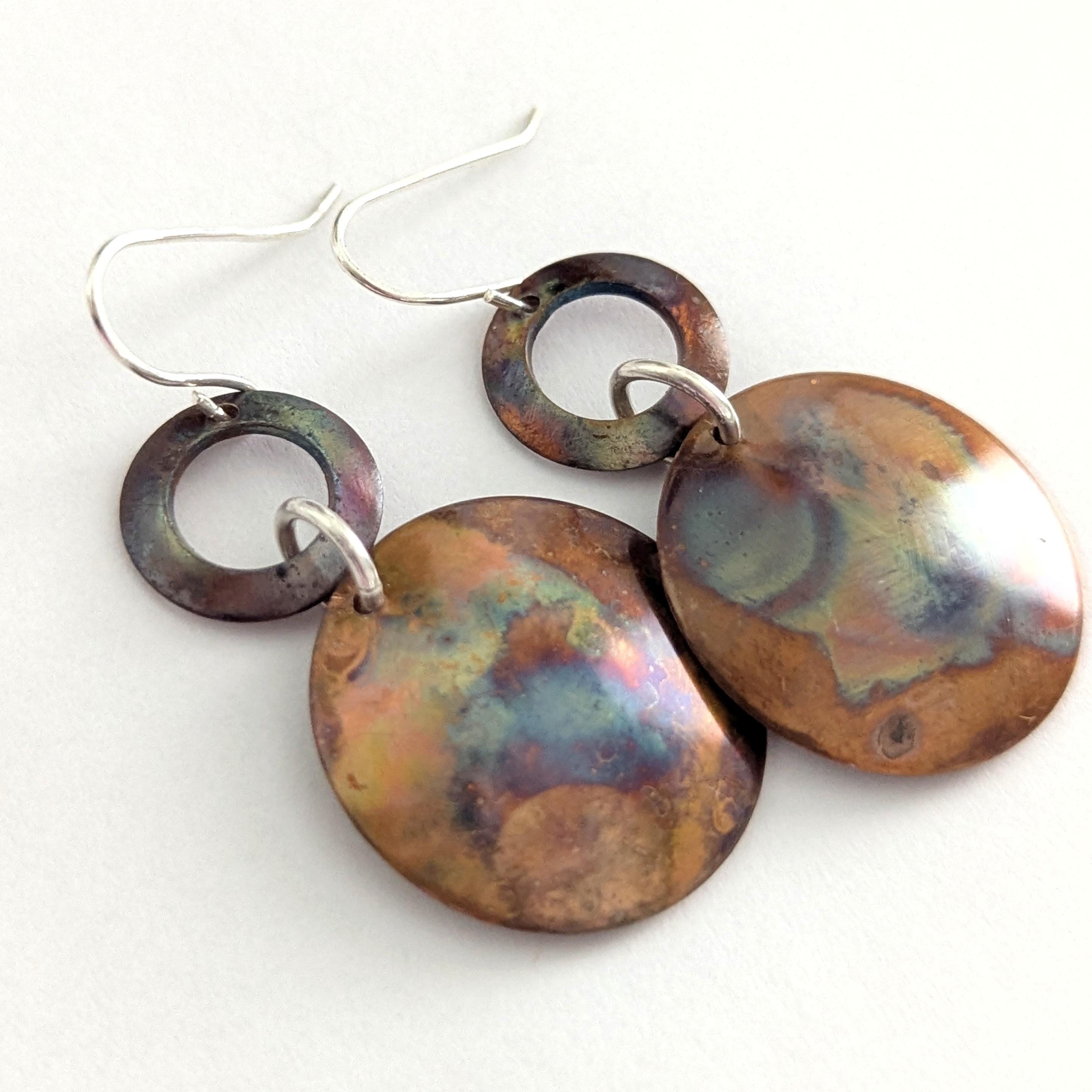 Flame painting is a technique that brings out natural colours from the copper. Each pair of earrings is unique with an organic effect.
