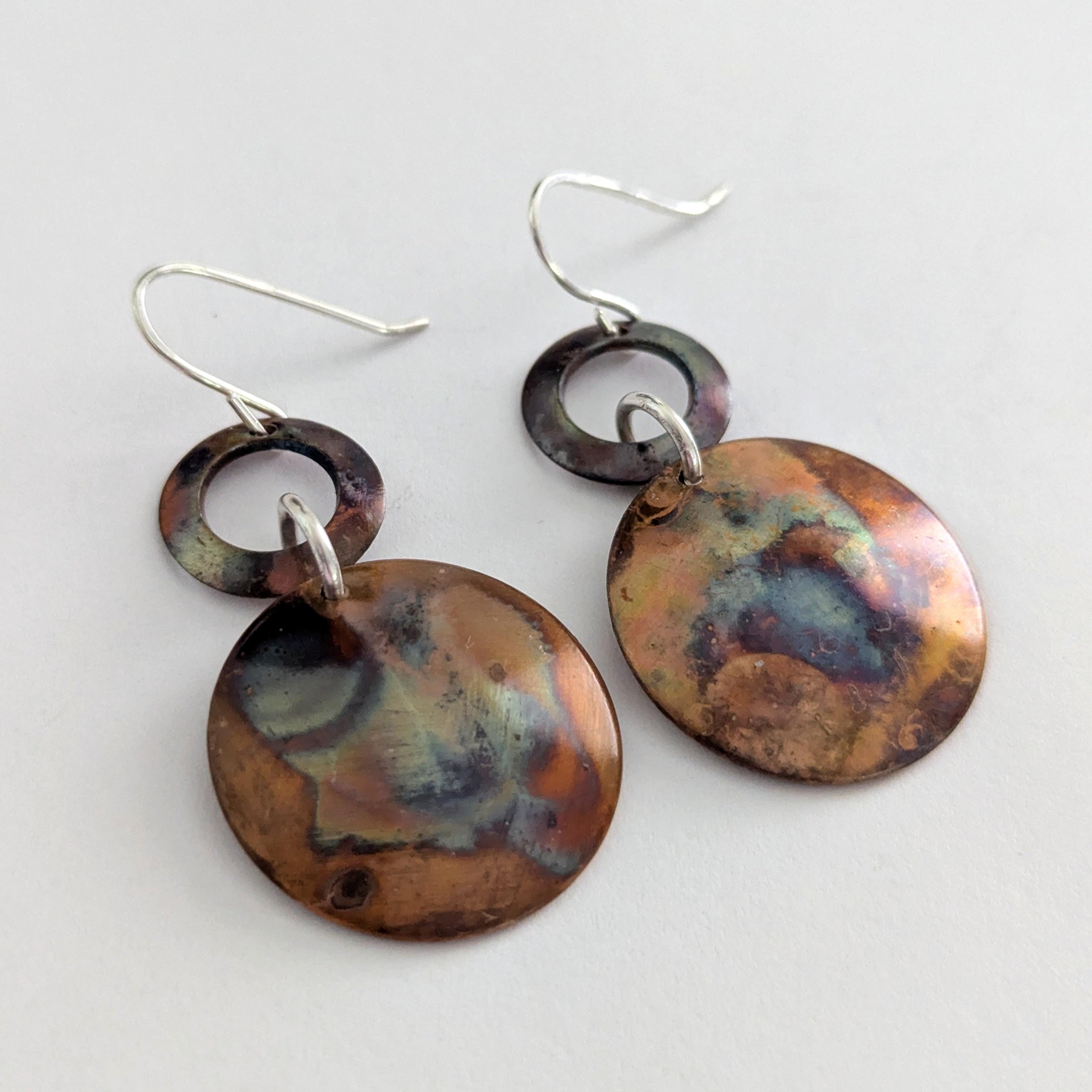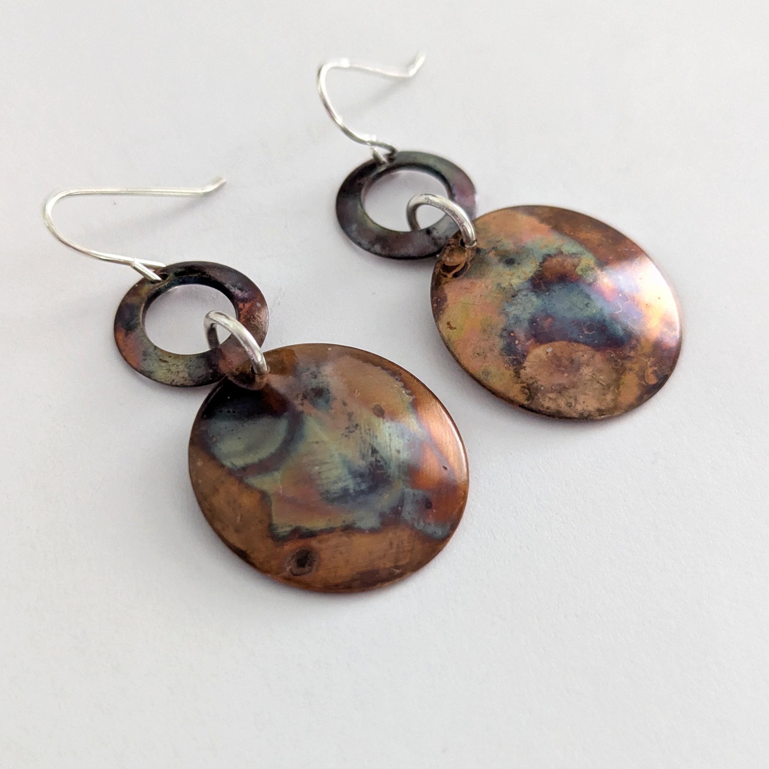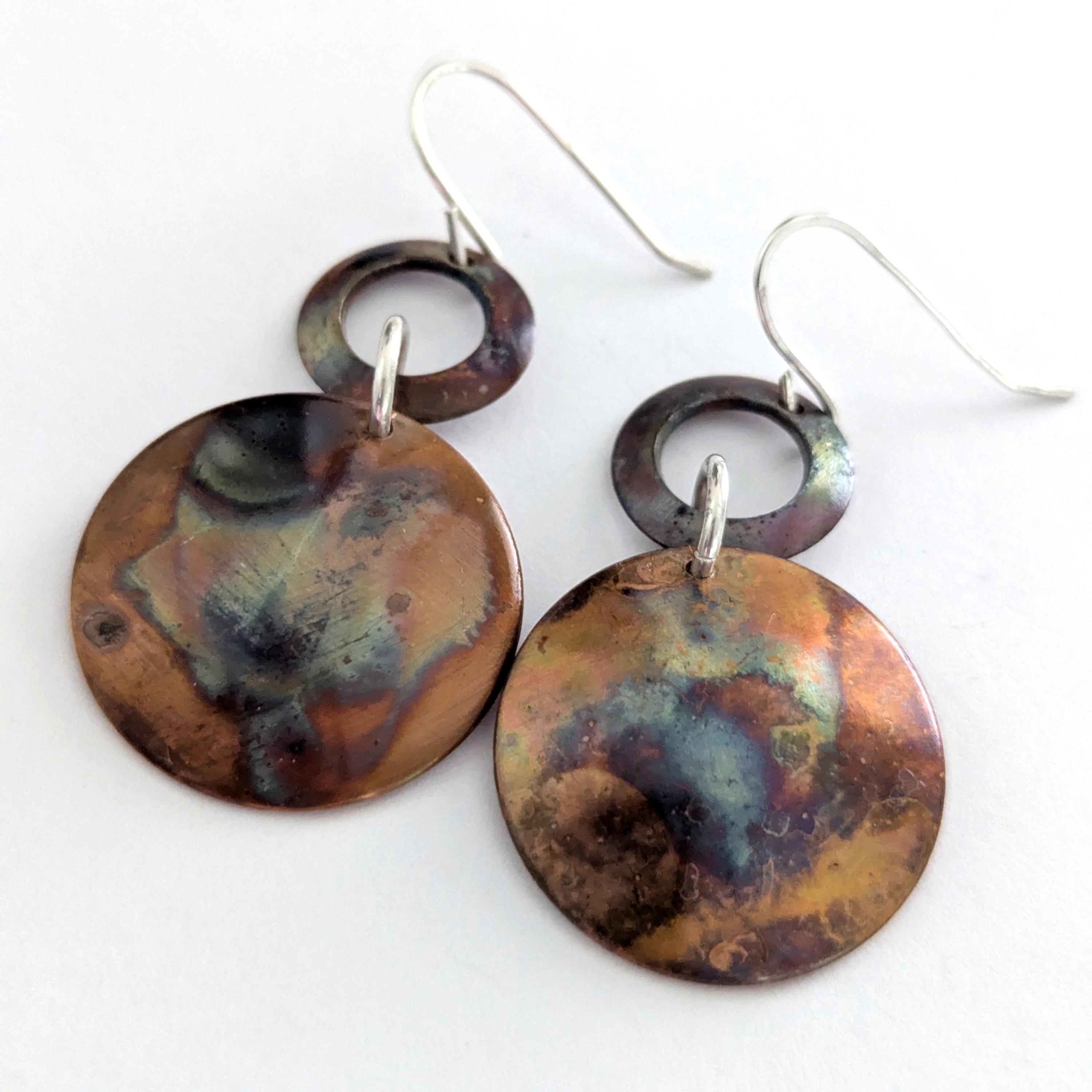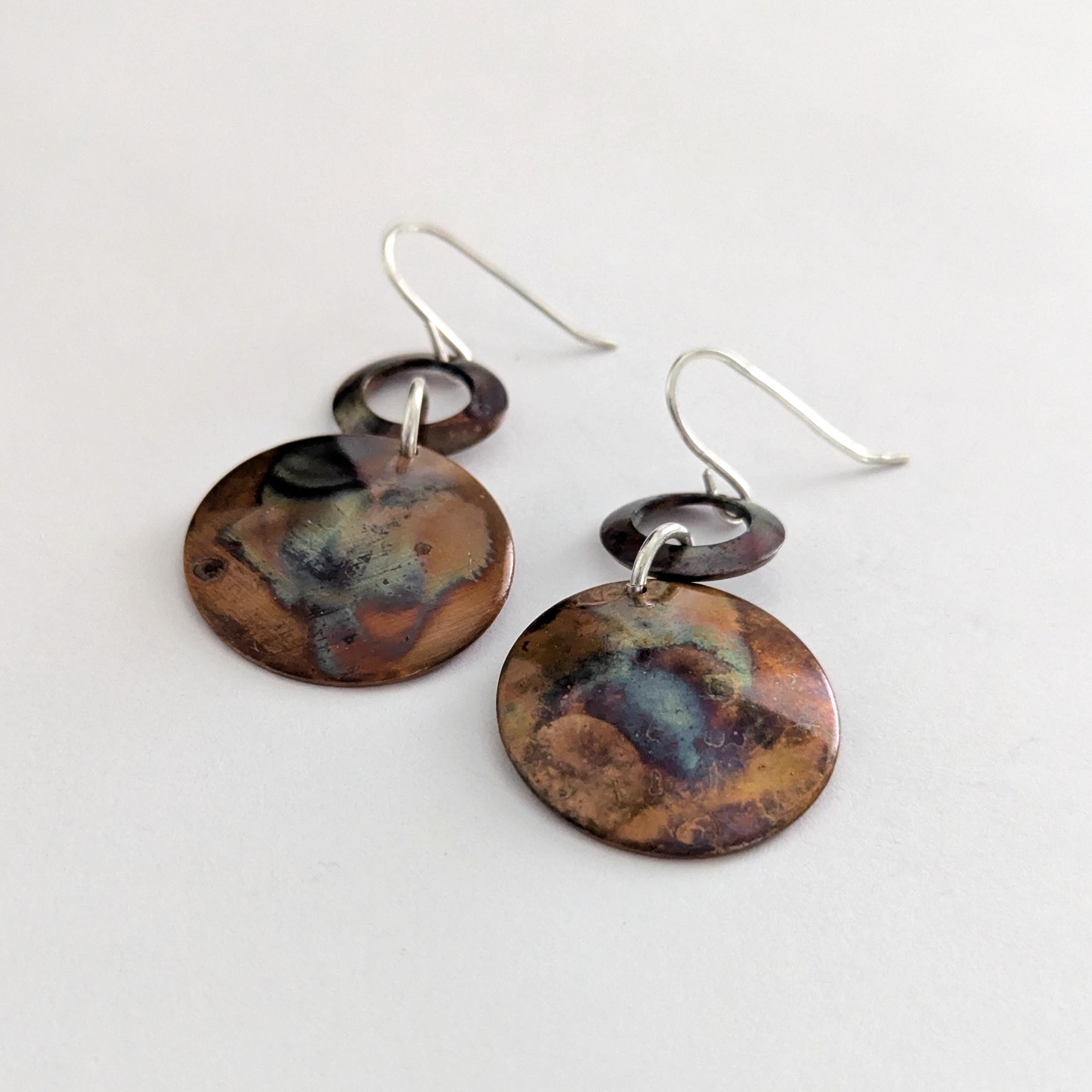 Flame painting is a technique that brings out natural colours from the copper. Each pair of earrings is unique with an organic effect.