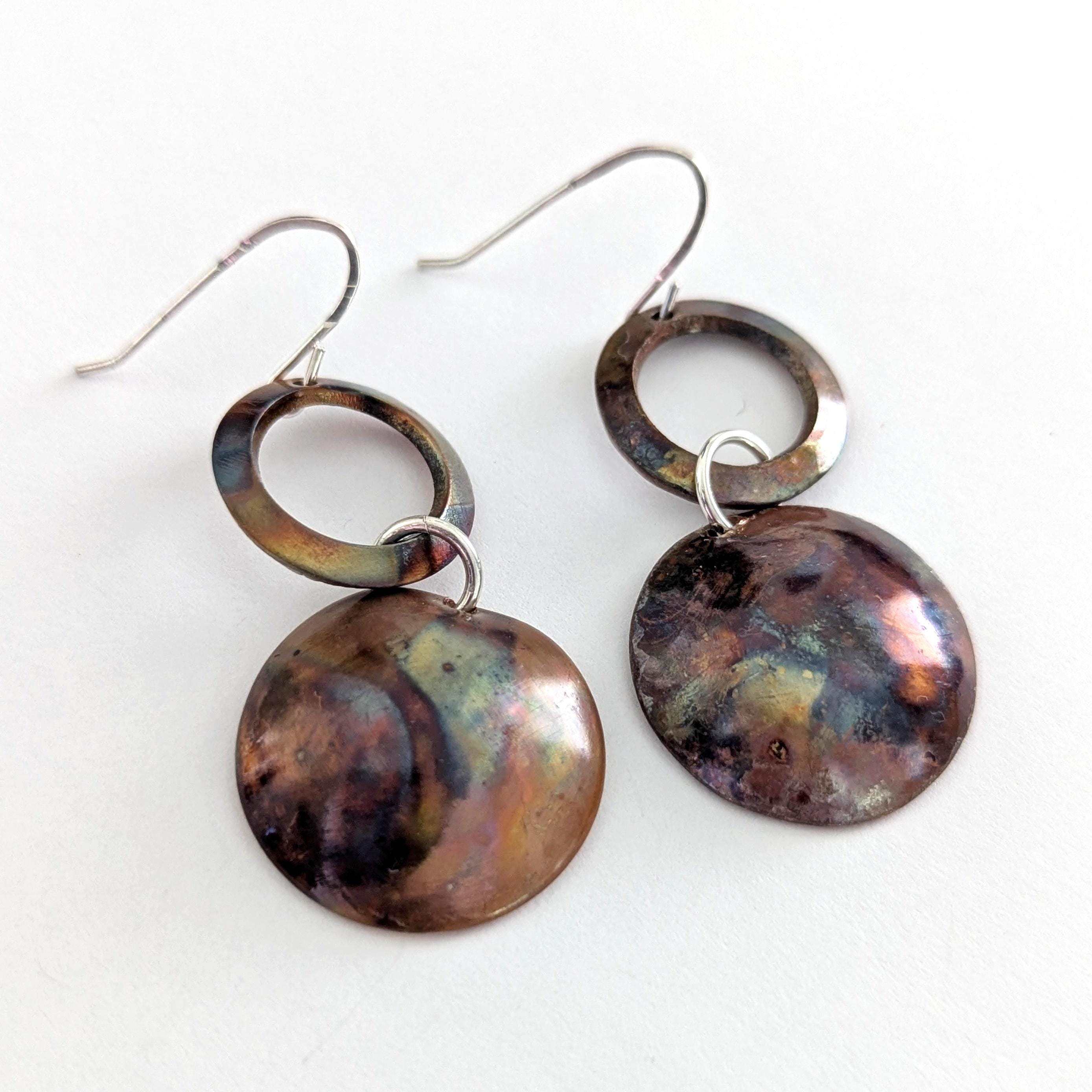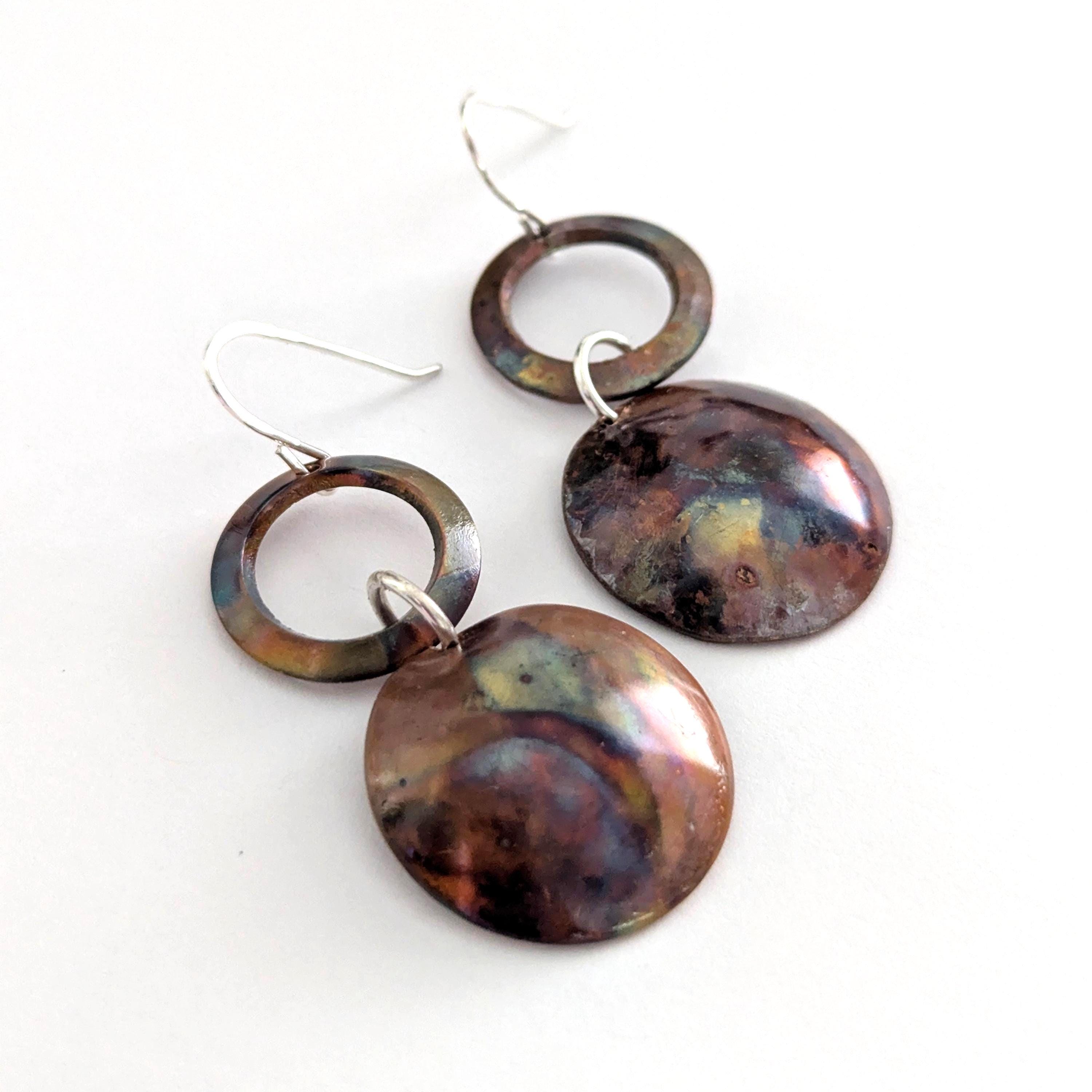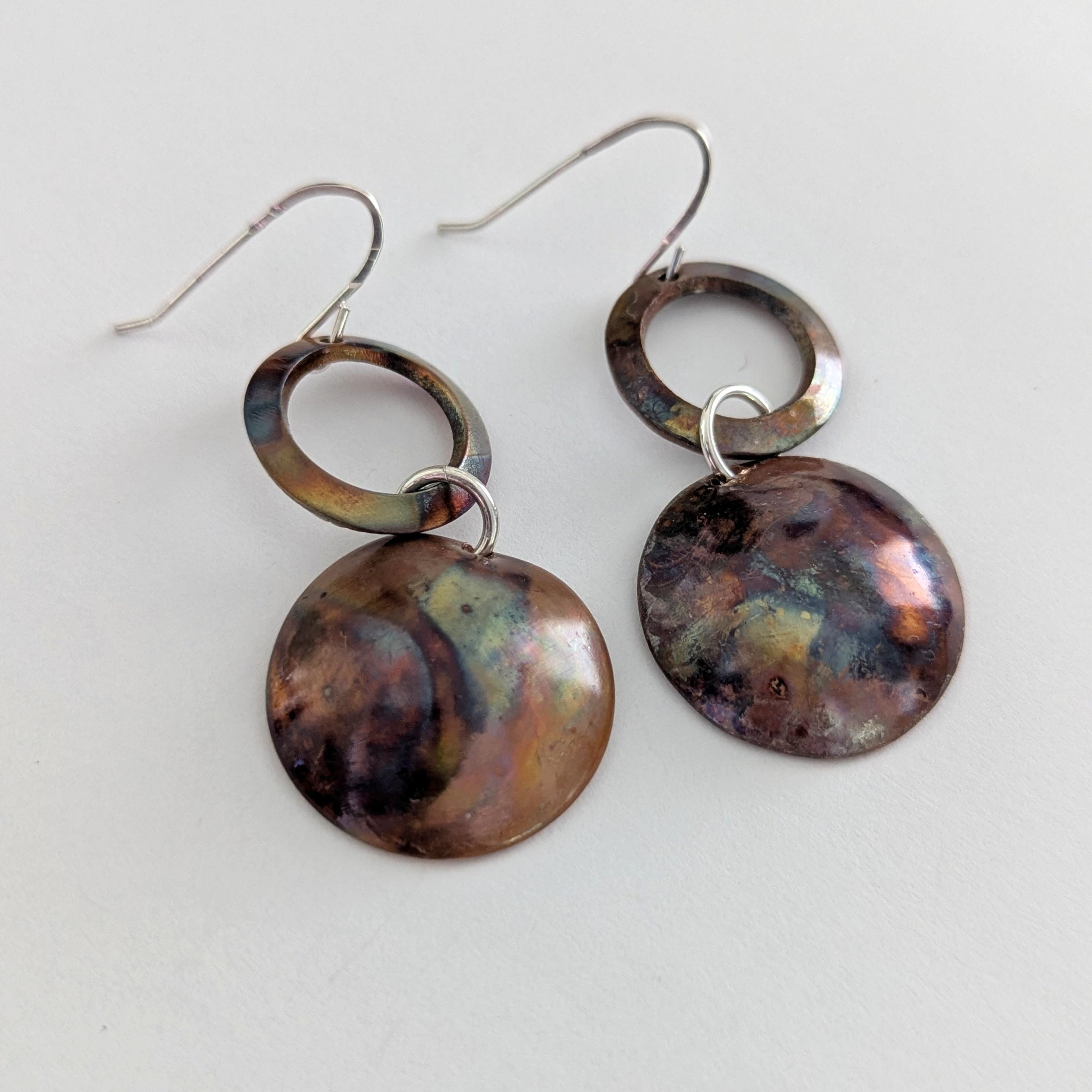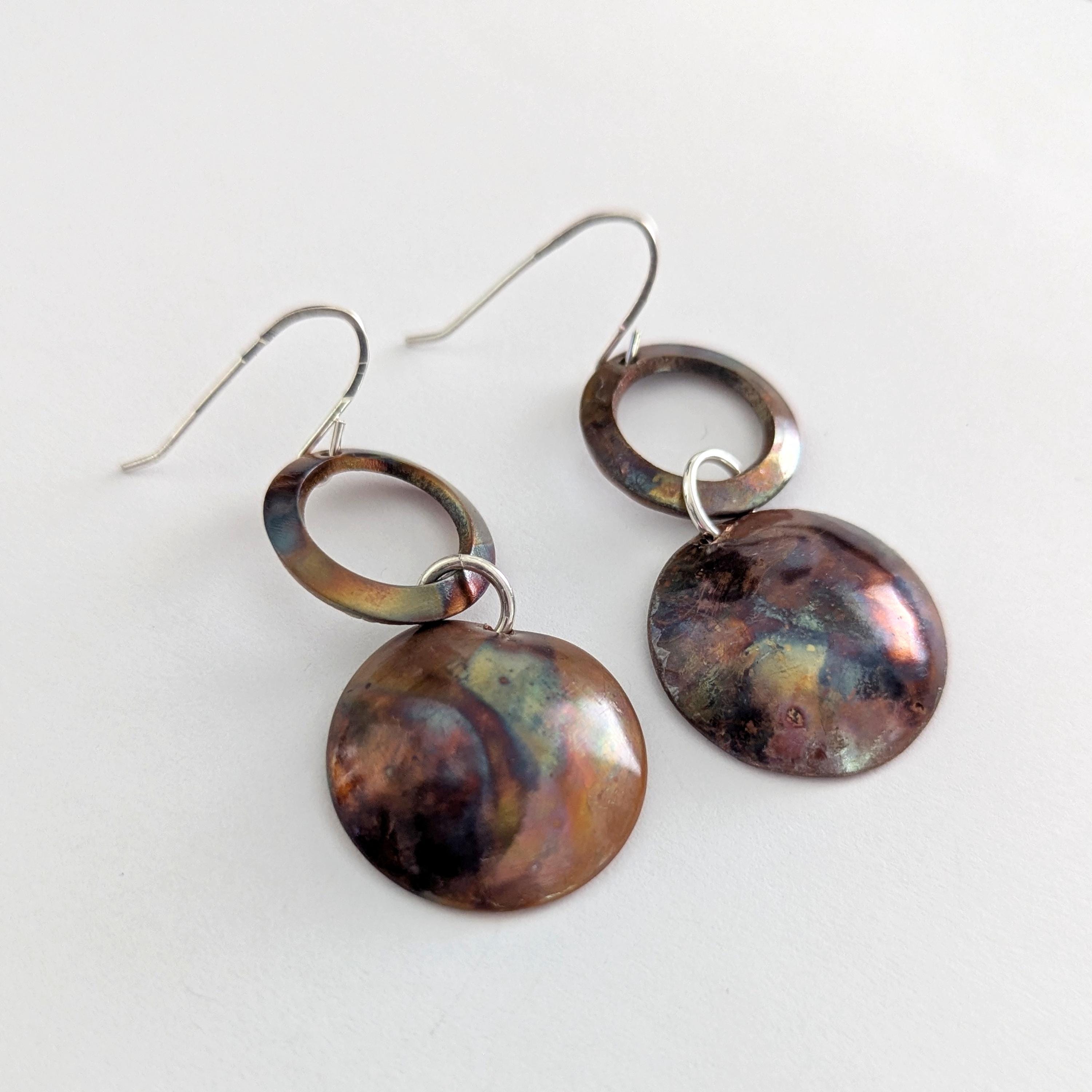 Flame painting is a technique that brings out natural colours from the copper. Each pair of earrings is unique with an organic effect.
