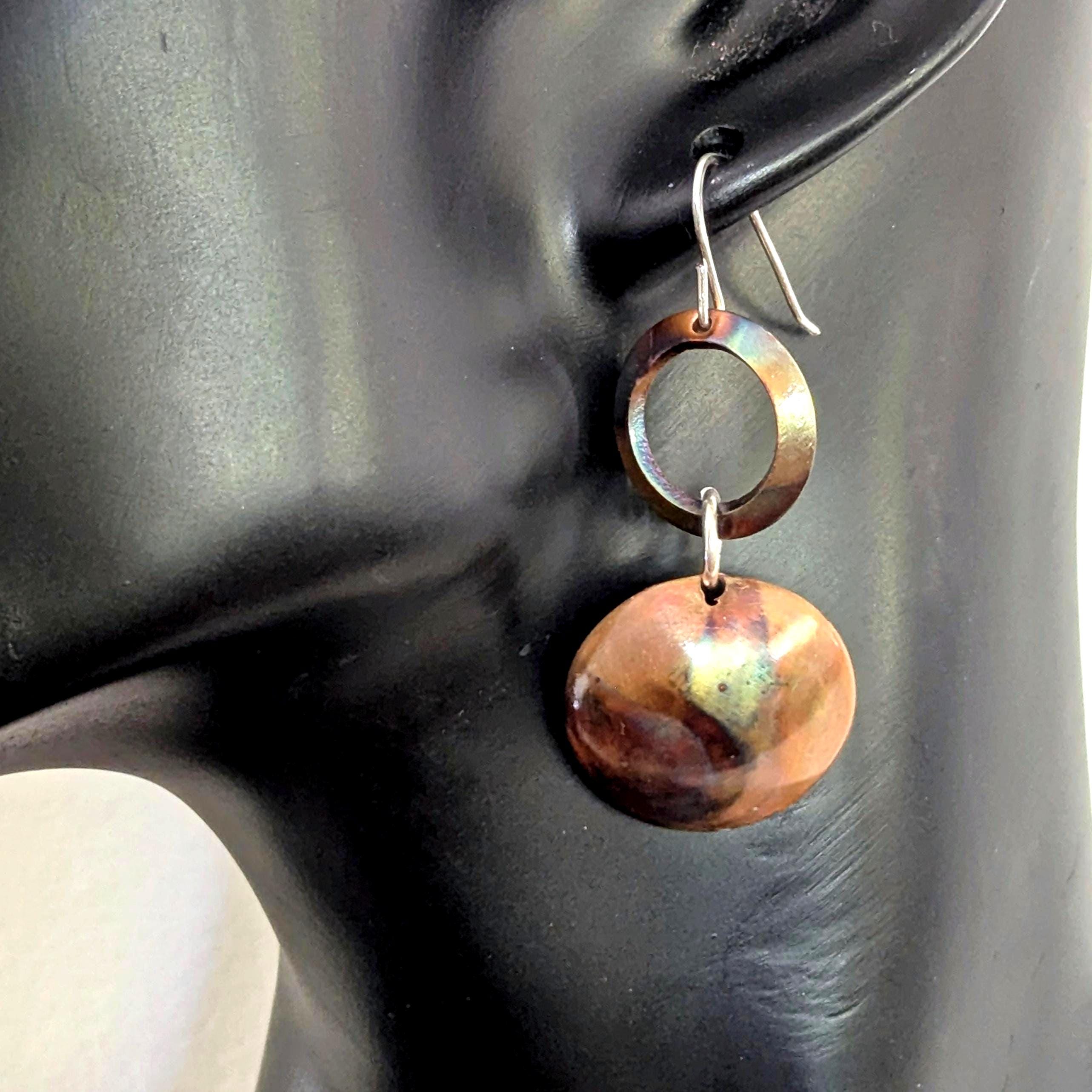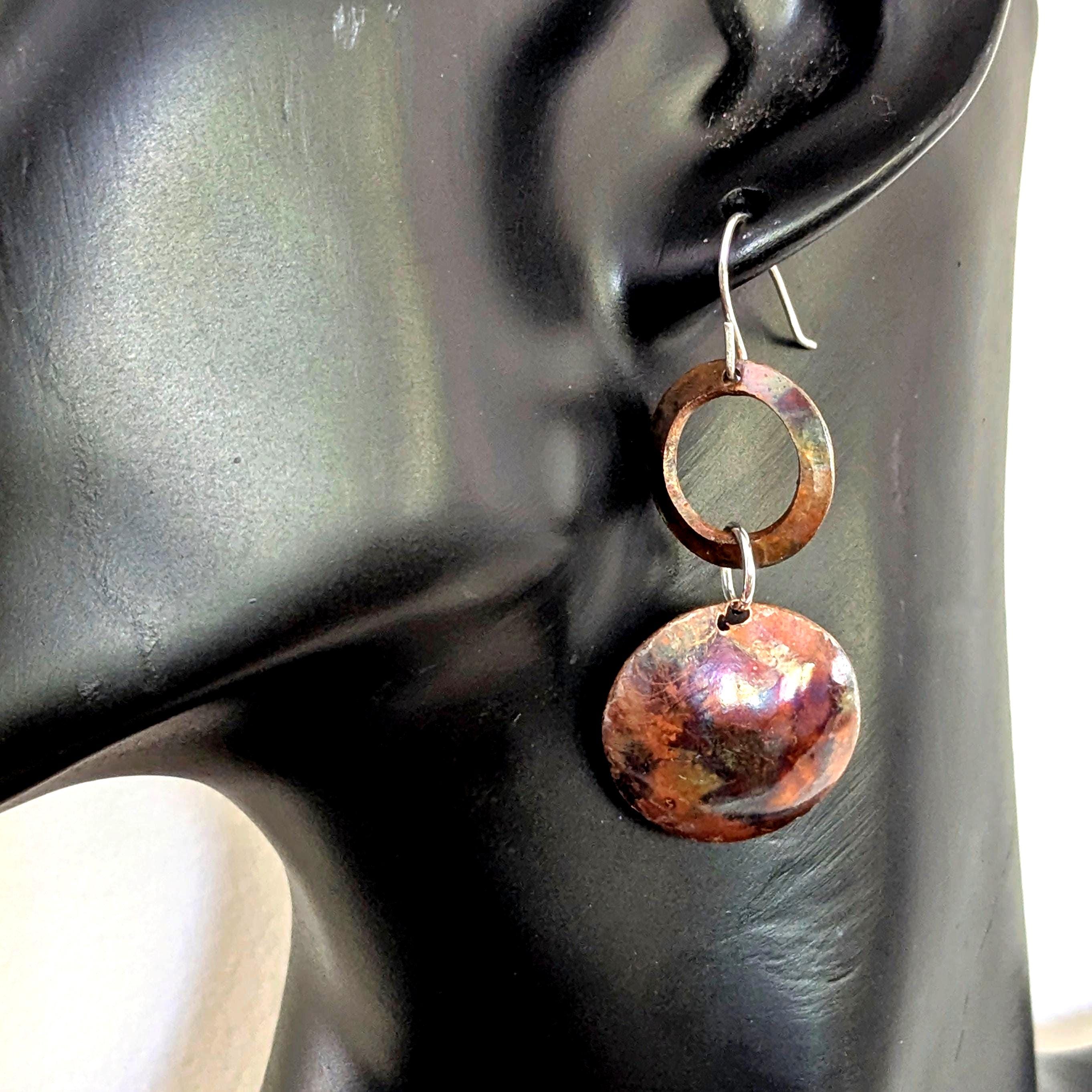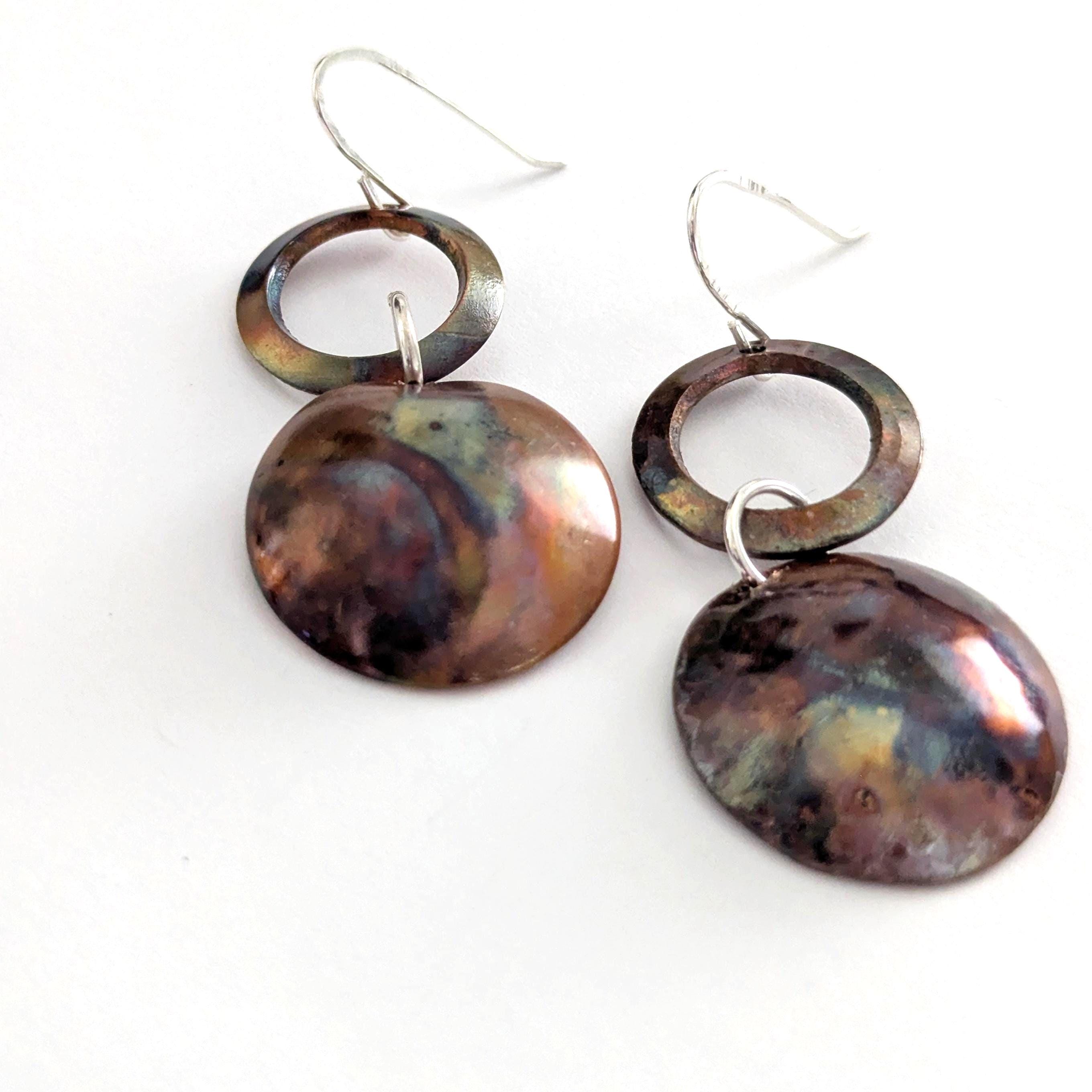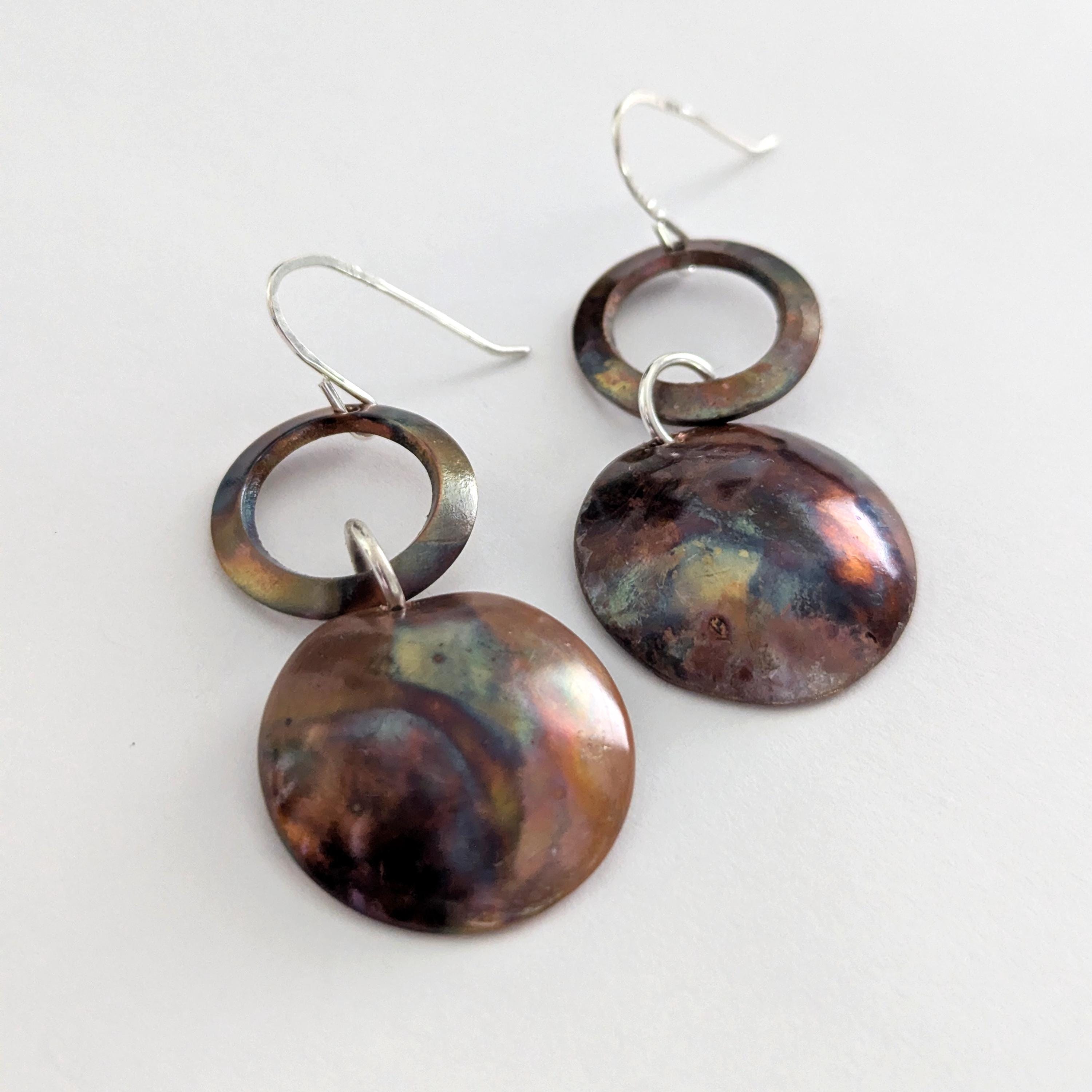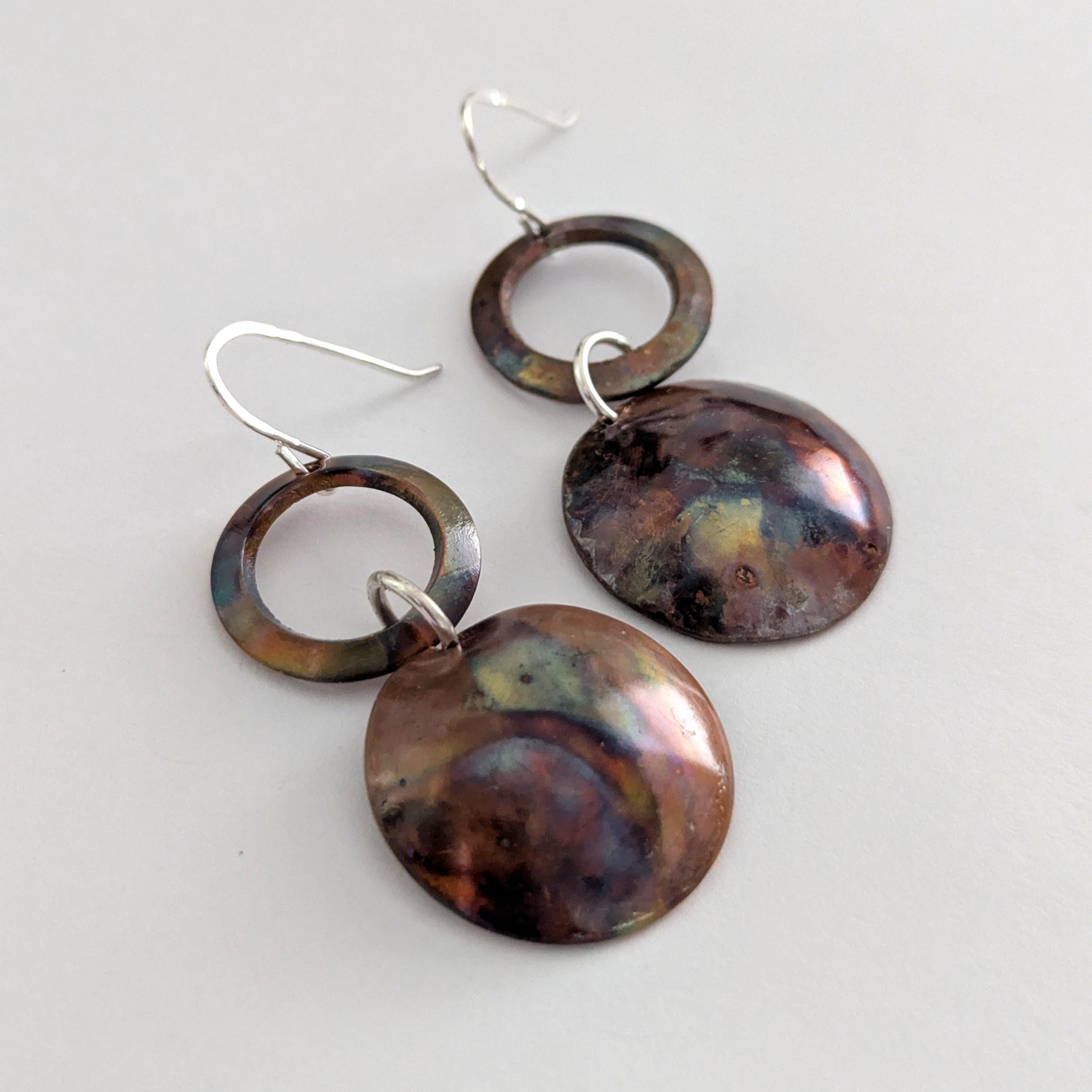 Flame painting is a technique that brings out natural colours from the copper. Each pair of earrings is unique with an organic effect.