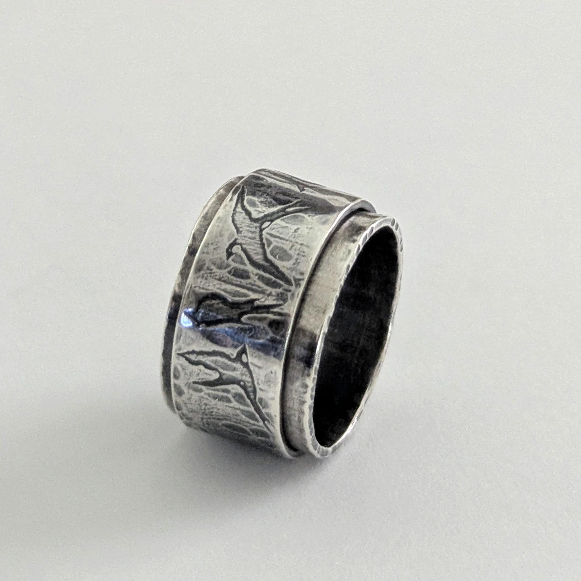 Flying birds silver spinner ring, with heart detail