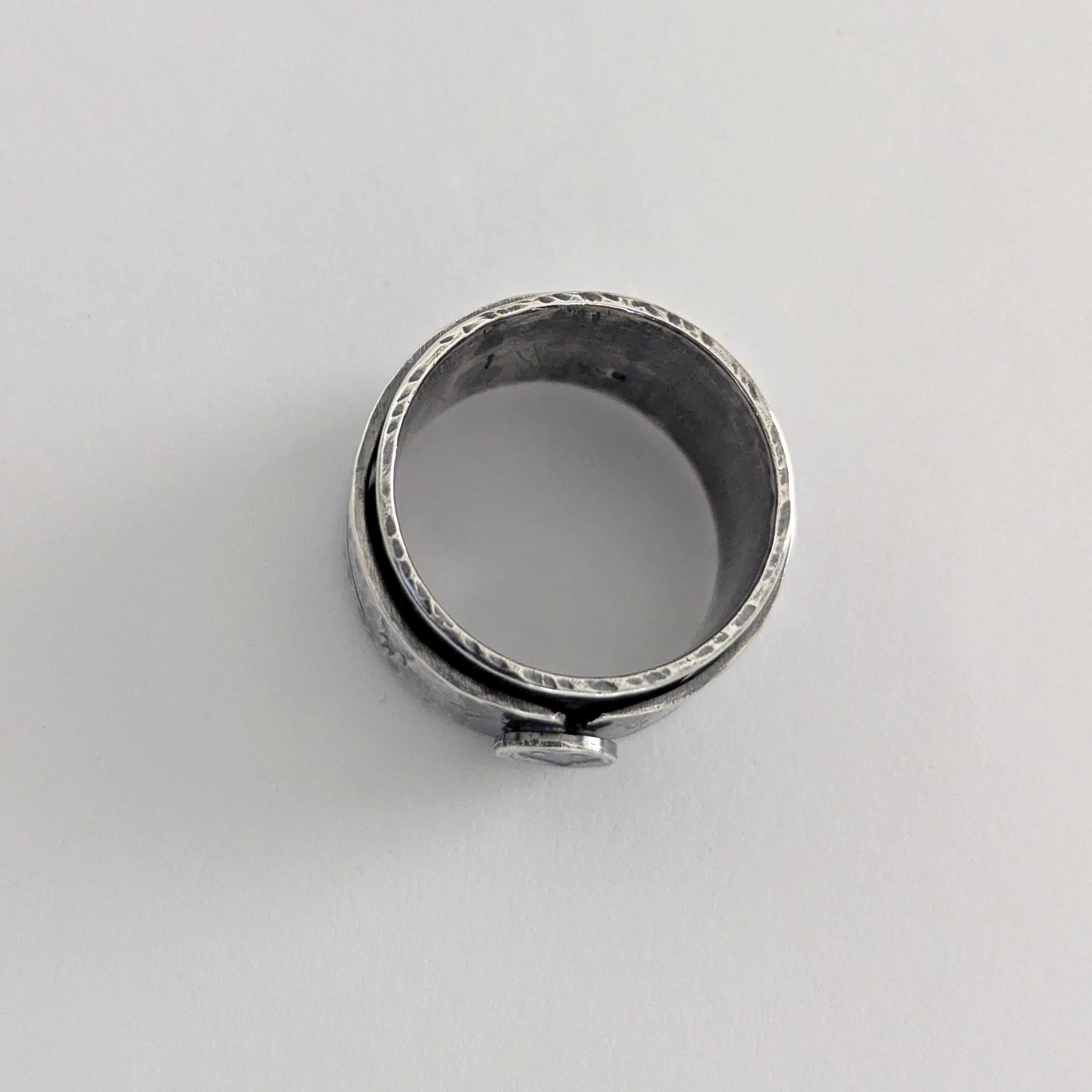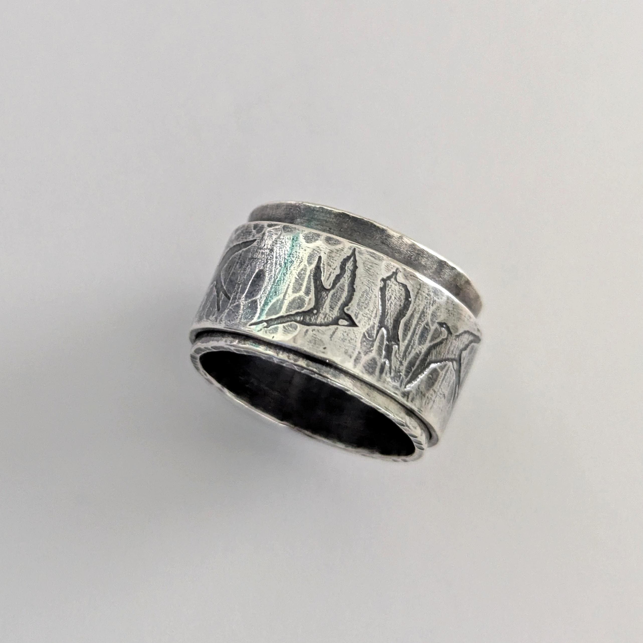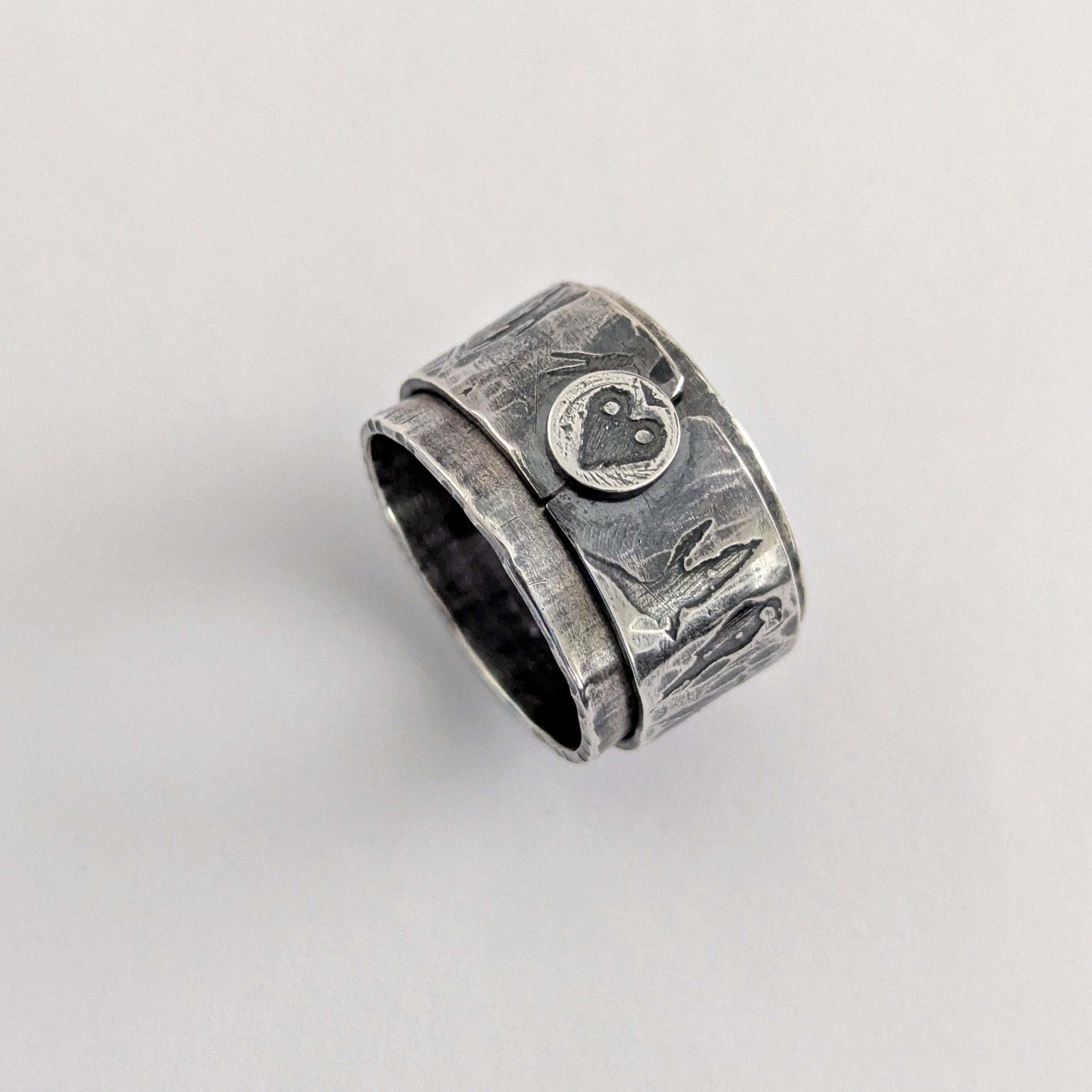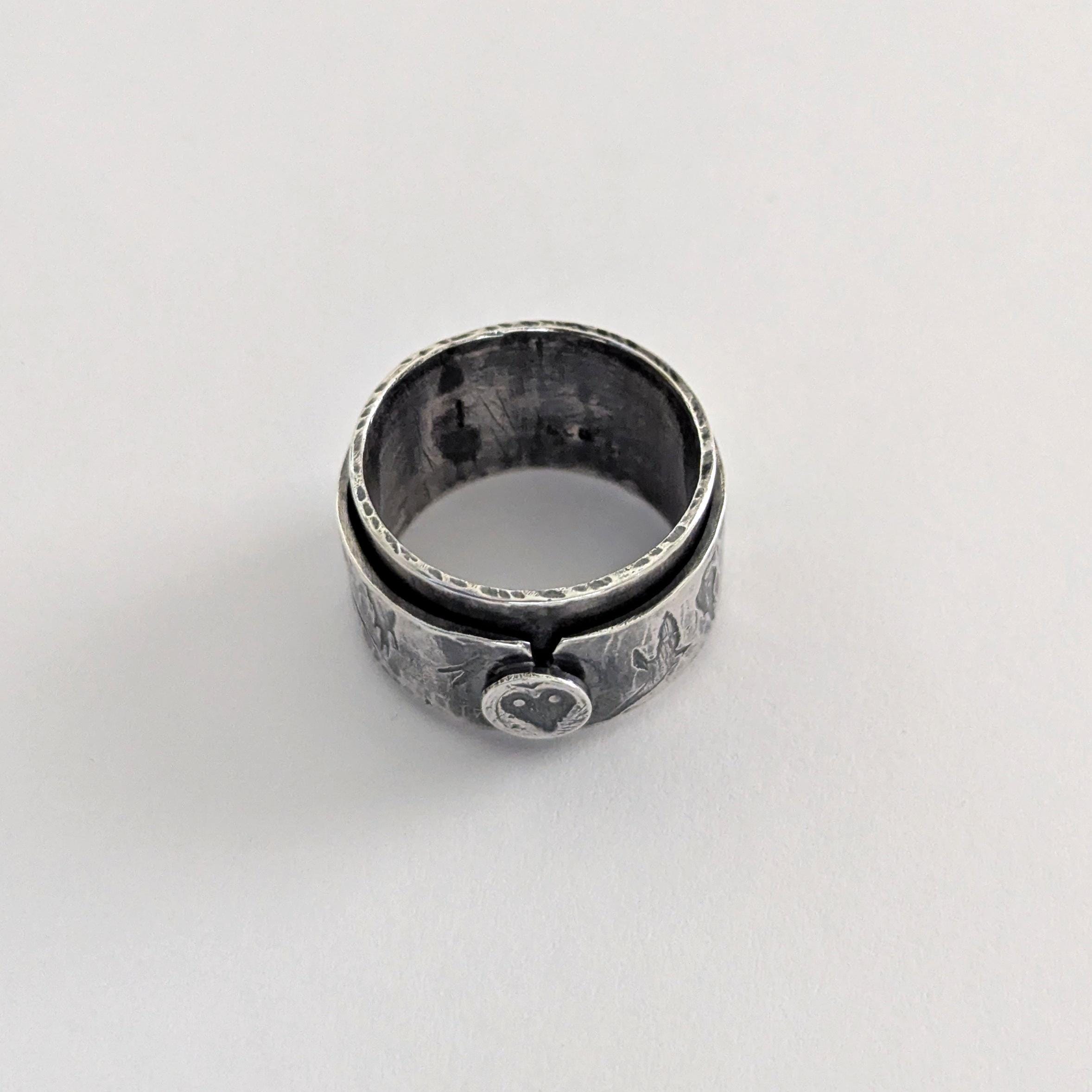This ring is a beautiful piece of jewellery that can help alleviate anxiety or nervous tension. Featuring textures and patterns to rest your gaze on while providing a landscape to feel with your fingertips with moving parts to twirl around.