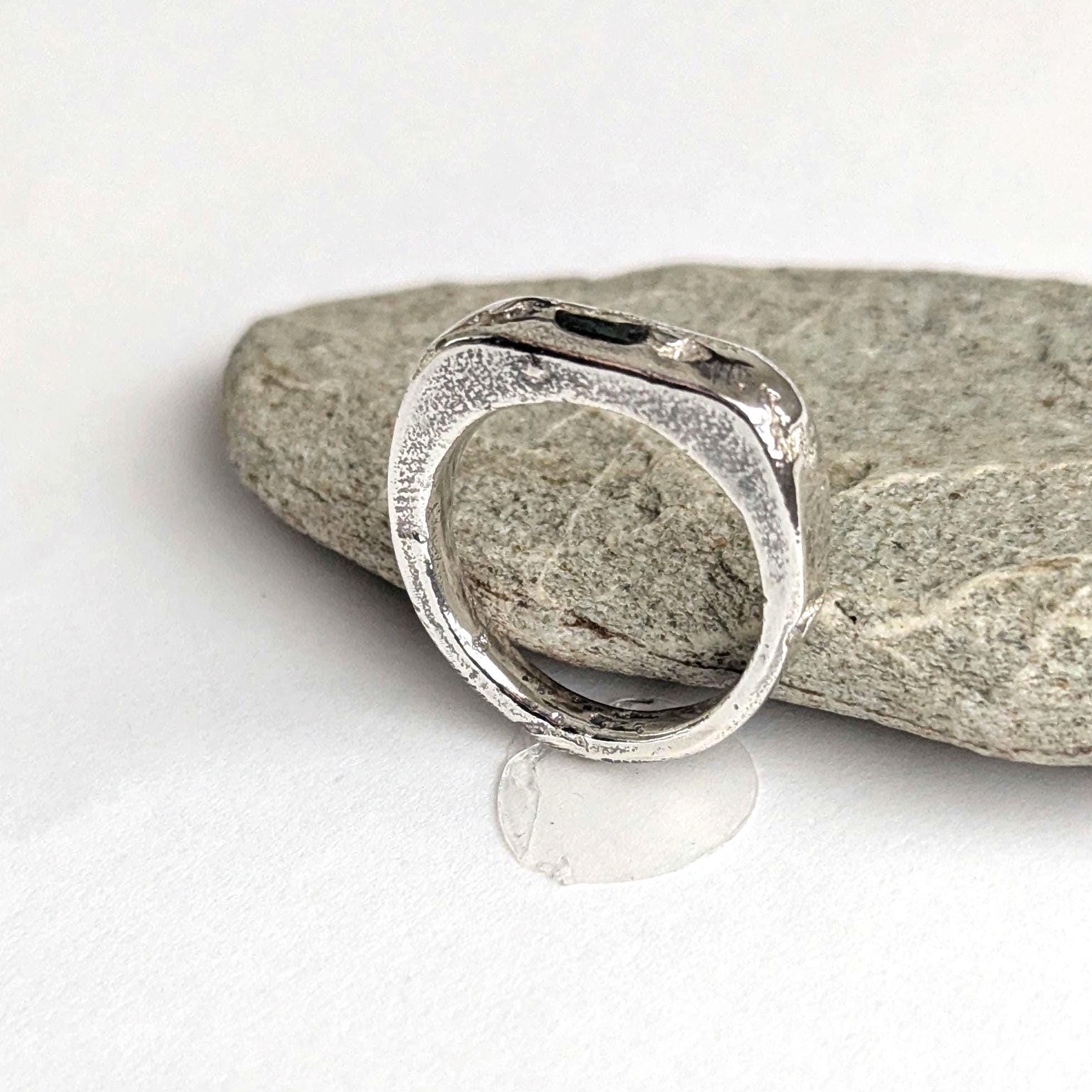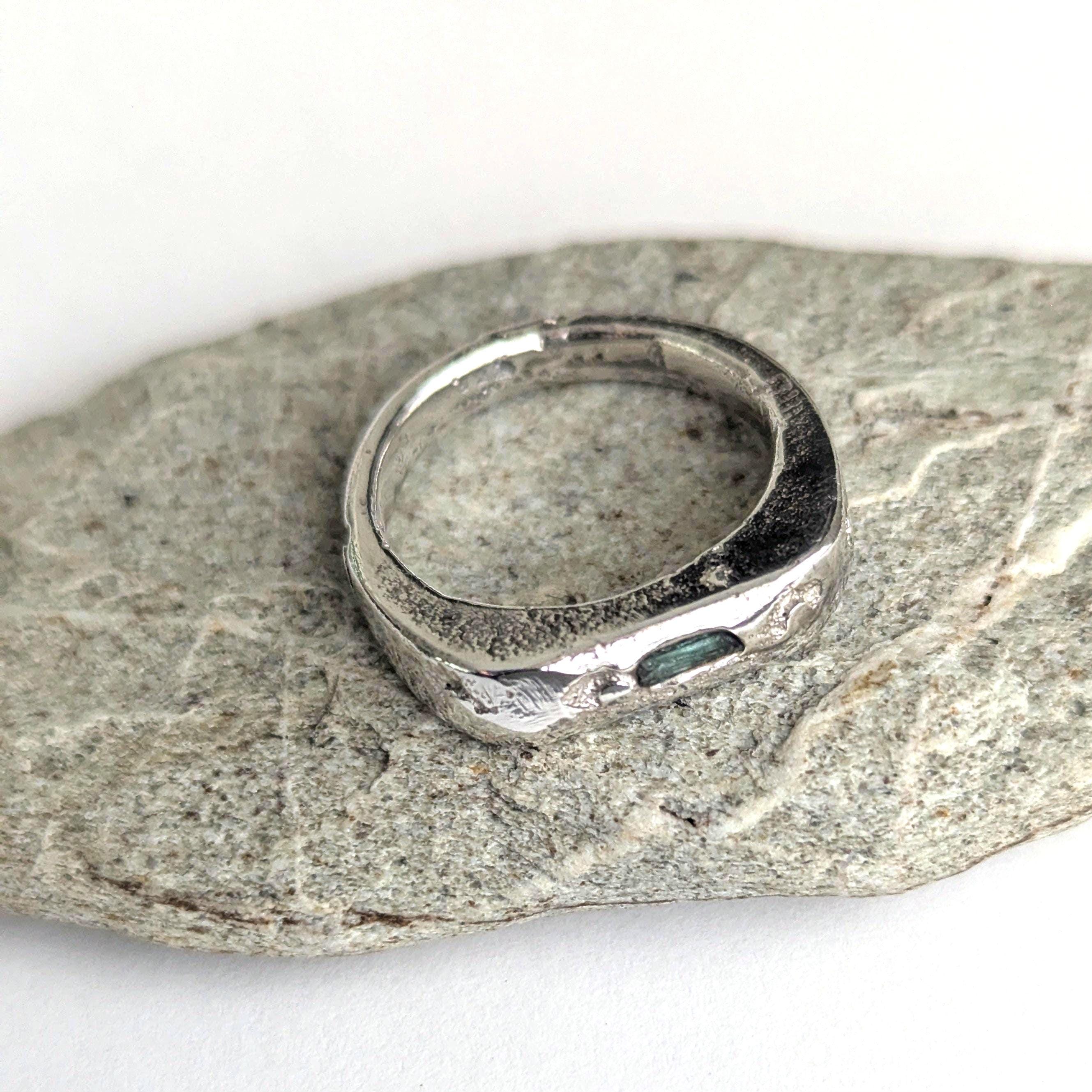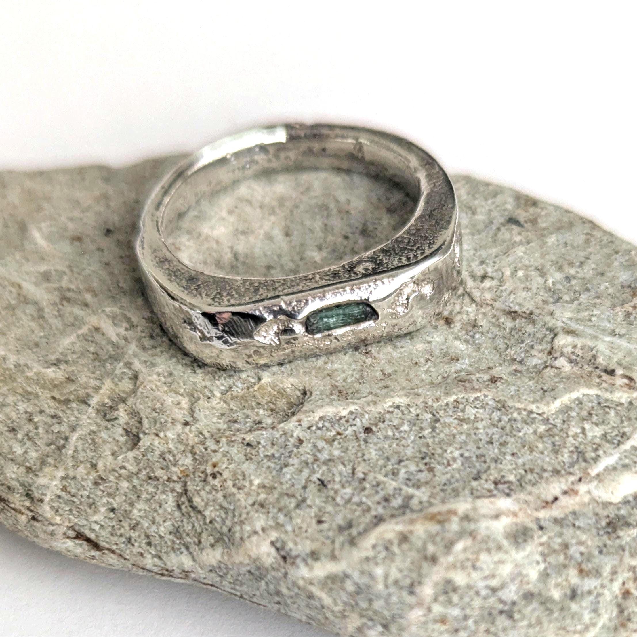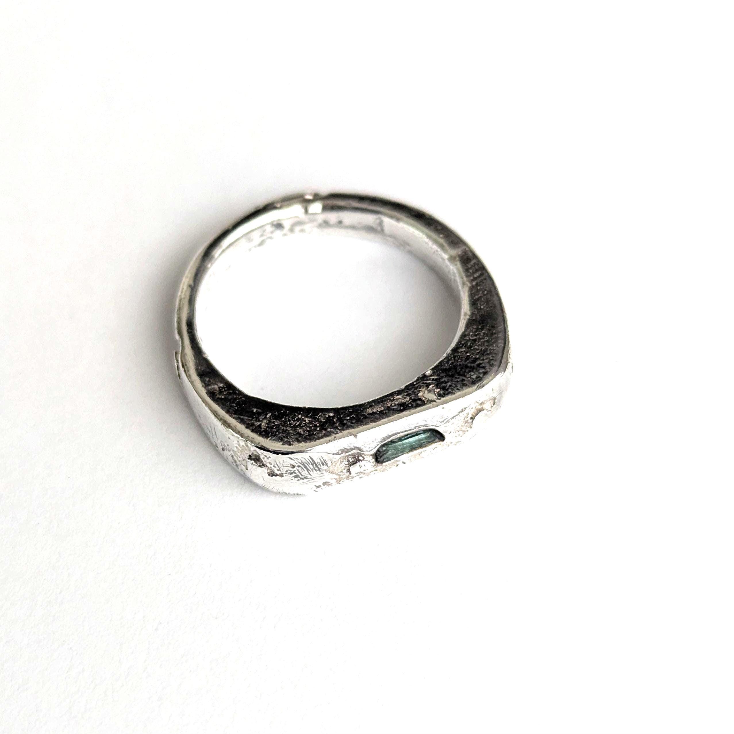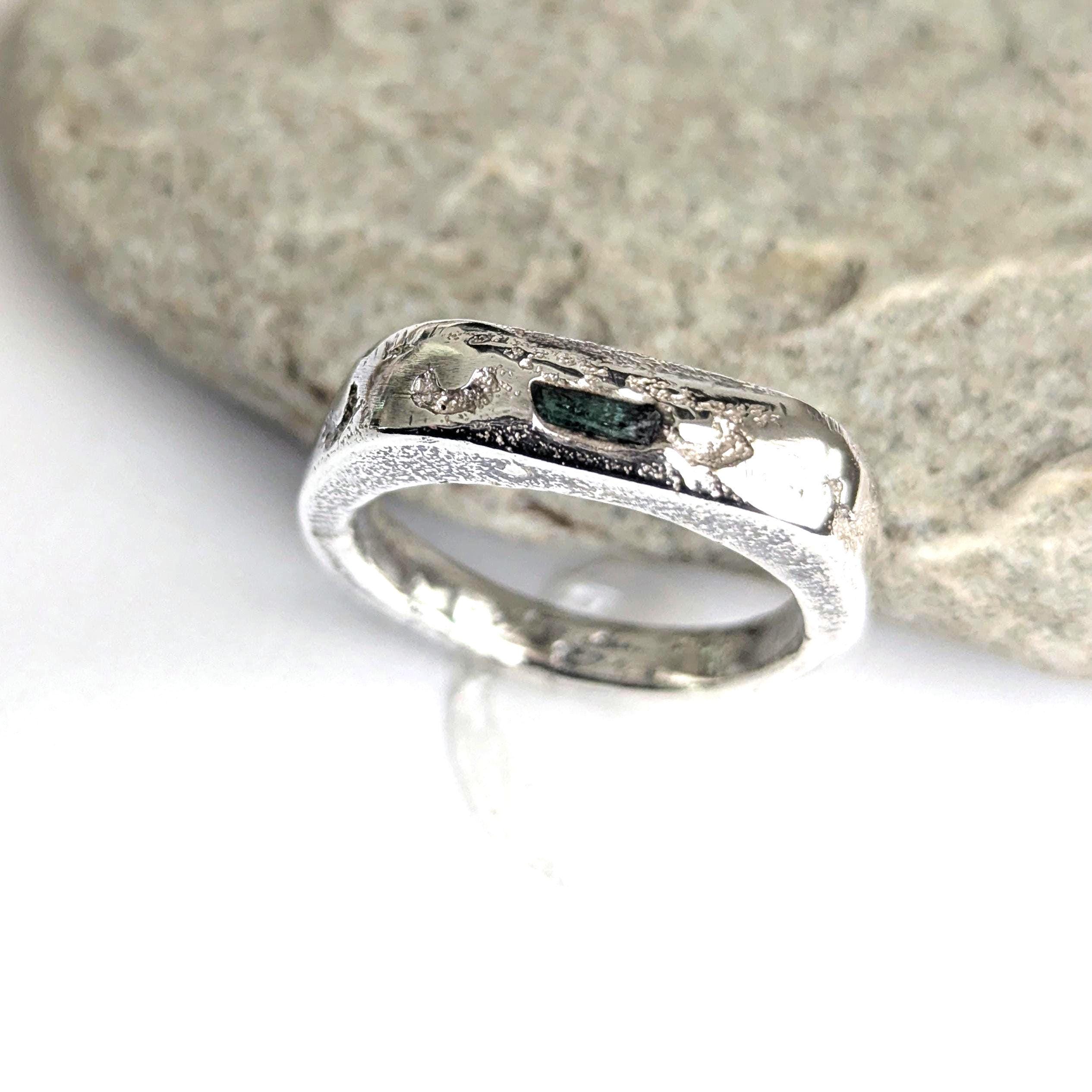 Sandcast silver signet ring with a raw emerald.